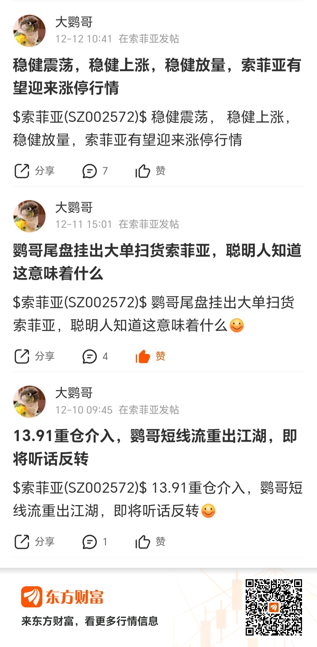 $索菲亚(SZ002572)$ 鹦哥13.91,13.83分批扫货索菲亚,由于突遇股海生涯以来最爱之股,周一清仓一切无关紧要之股,包括索菲亚。所有仓位严阵以待,迎击st人福
