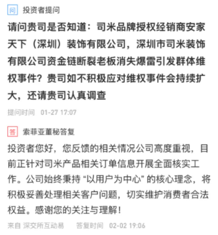 另外2026年1月底,已有投资者在深交所互动易平台向索菲亚管理层提问,询问深圳司米装饰资金链断裂等情况。明确提醒“司米橱柜深圳经销商安家天下疑似资金链断裂,贵司如不积极应对,维权事件将会持续扩大。”