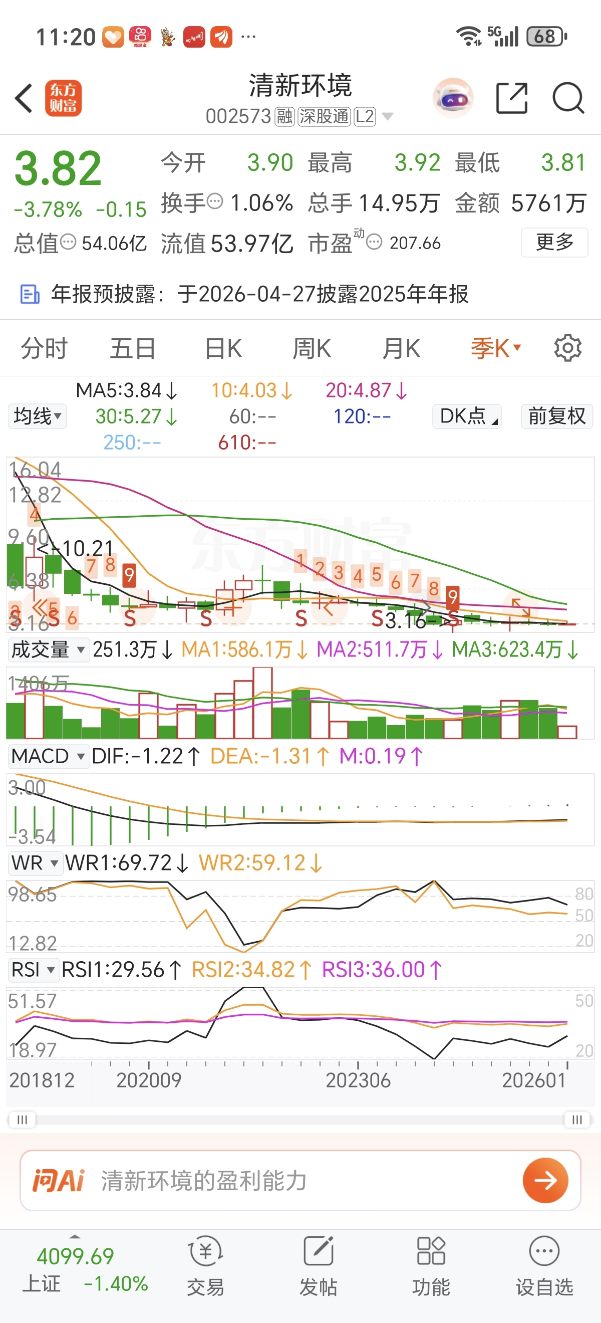 $清新环境(SZ002573)$ 打开季线,上涨才刚刚开始,下跌就加上涨就T掉,奔着一年玩