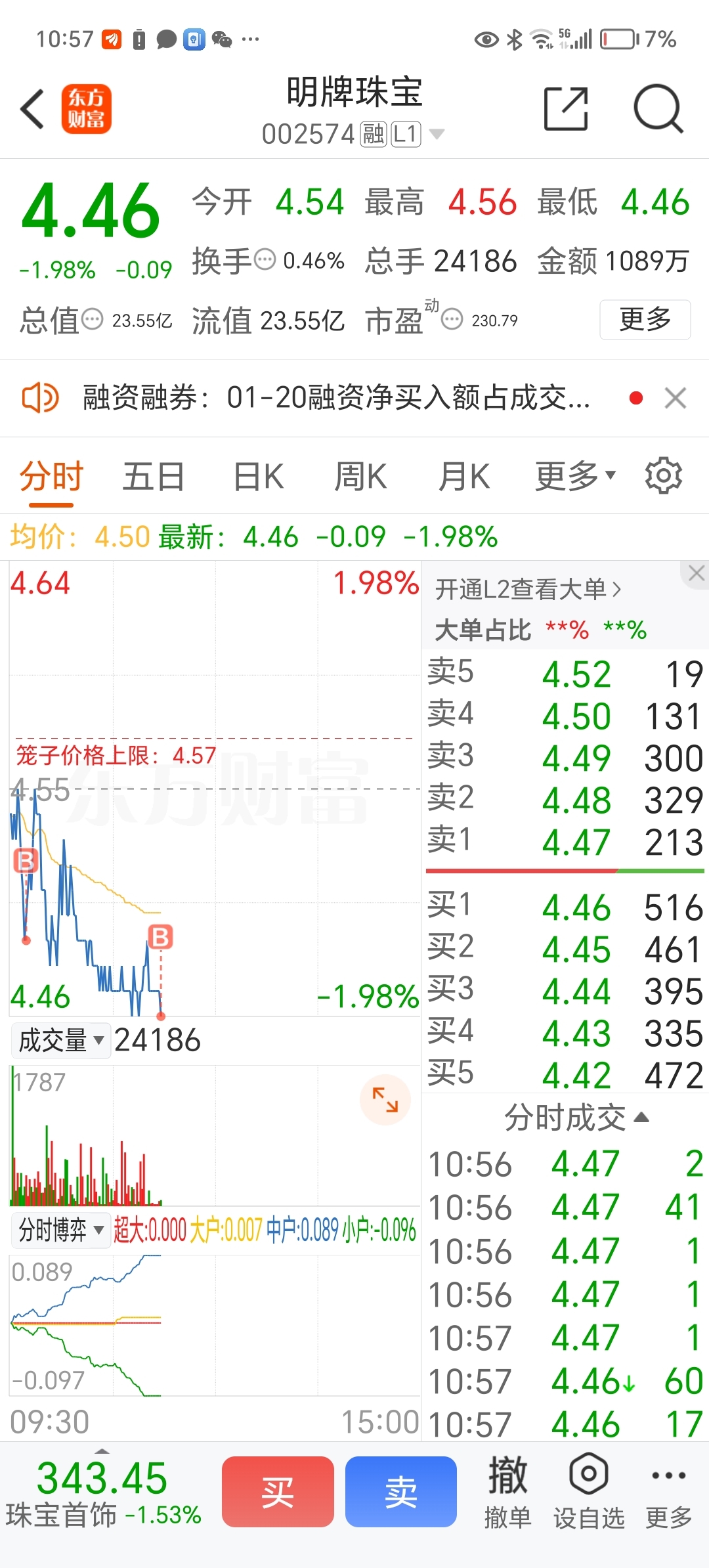$明牌珠宝(SZ002574)$ 收坡烂了,446的己成