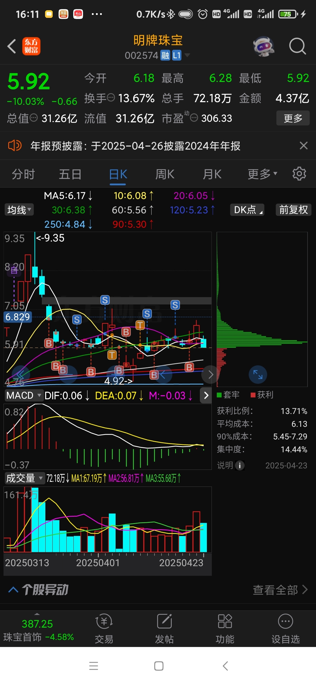 $明牌珠宝(SZ002574)$ 拿了一个多月几乎经历6个跌停,又要回到解放前?
