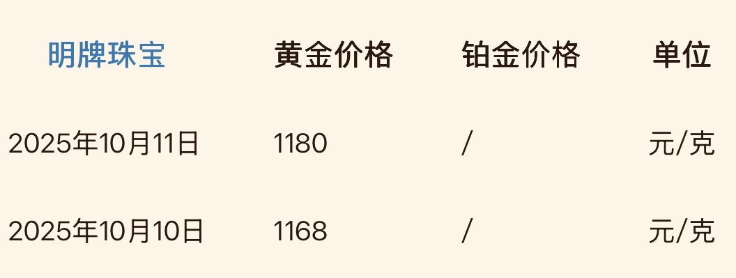 2025年10月11日,实物黄金明牌珠宝黄金报价1180元/克,相比上一个交易日上涨了12元/克。