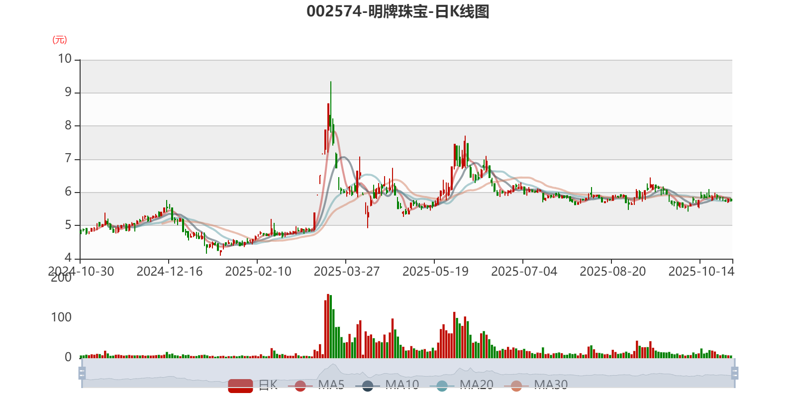 以10月29日收盘价计算,明牌珠宝目前市盈率(TTM)约为-31.31倍,市净率(LF)约1.02倍,市销率(TTM)约1倍。