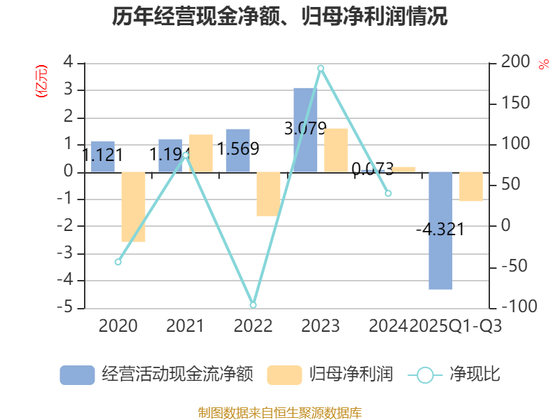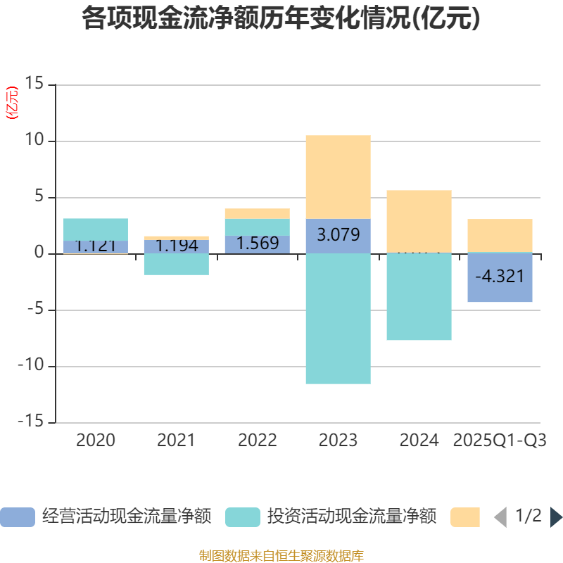 2025年前三季度,公司经营活动现金流净额为-4.32亿元,同比减少2.89亿元;筹资活动现金流净额2.93亿元,同比减少3.19亿元;投资活动现金流净额1243.15万元,上年同期为-8.25亿元。