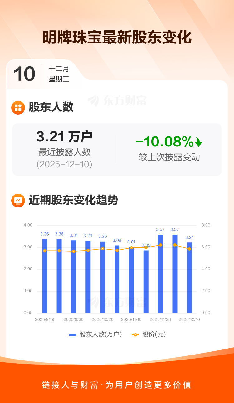 明牌珠宝:截至12月10日最新股东户数3.21万户,较上期减少10.08%