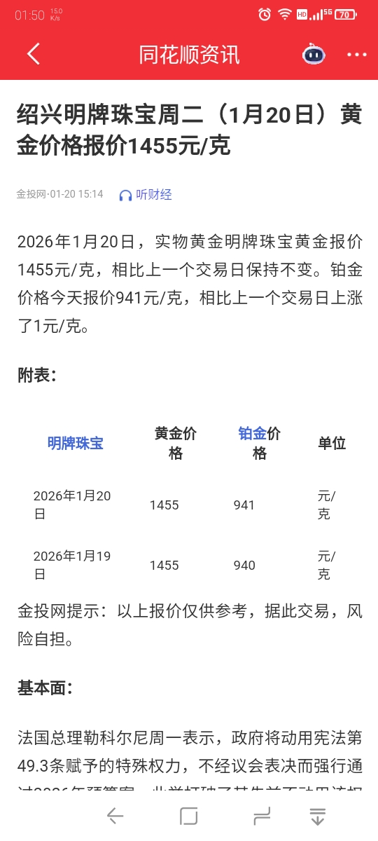 20号的金饰1455元,21号已经升到1498元了。一个晚上每克涨价40元。