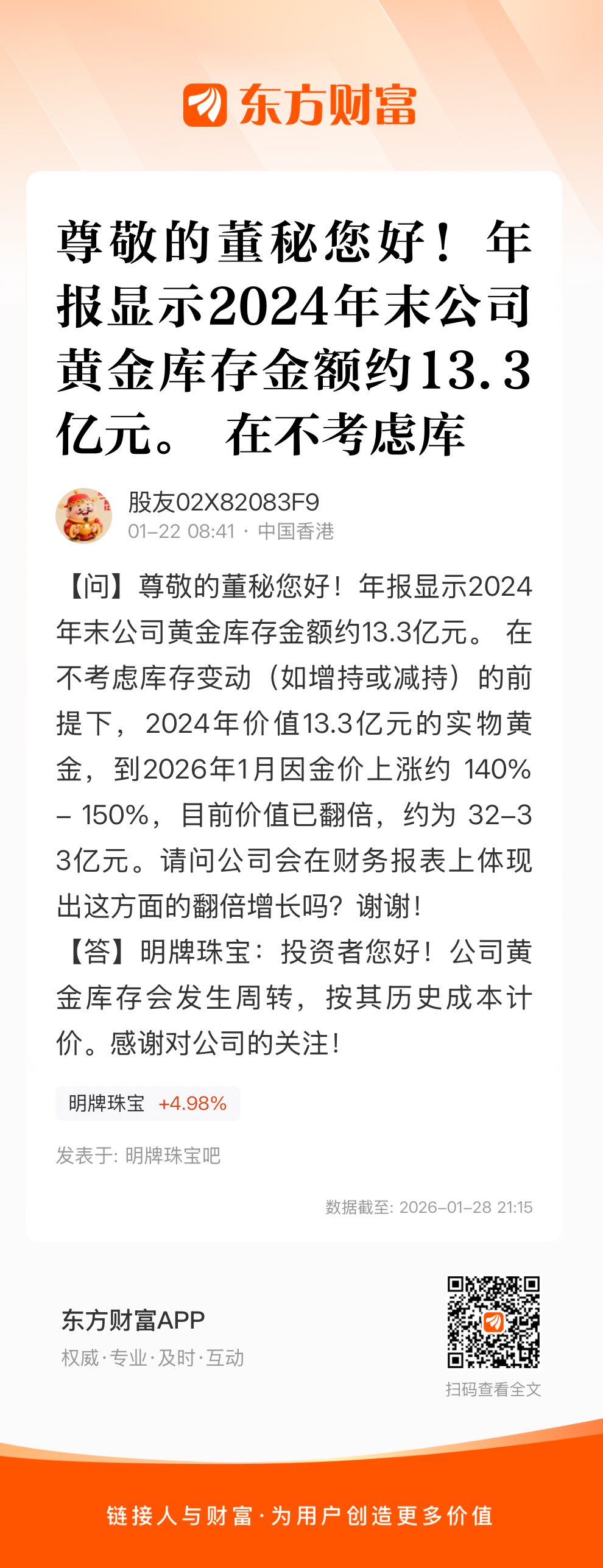 尊敬的董秘您好!年报显示2024年末公司黄金库存金额约13.3亿元。 在不考虑库存变动(如增持或减持)的前提下,2024年价值13.3亿元的实物黄金,到2026年1月因金价上涨约 140% - 150%,目前价值已翻倍,约为 32-33亿元。请问公司会在财务报表上体现出这方面的翻倍增长吗?谢谢!