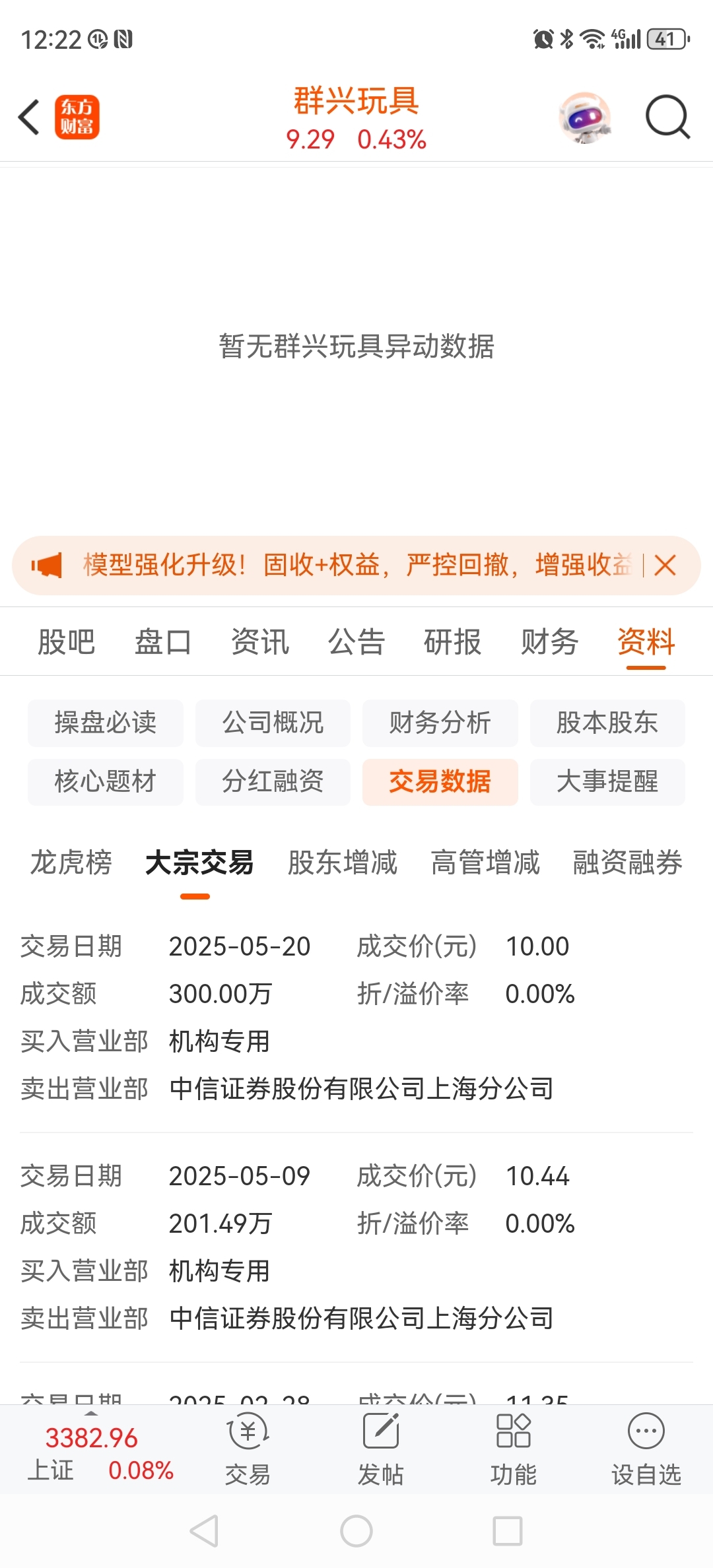 $群兴玩具(SZ002575)$ 机构高位大宗交易买入次日,就被砸盘套住,这个砸盘不好说是机构自砸还是老庄砸,机构大宗交易买入了有筹码可以砸,十元买入砸到9.14,再低价买回也有可能,机构既然介入了,不会轻易出局,那个大宗交易也说不清楚是否左右互倒$上证指数(SH000001)$
