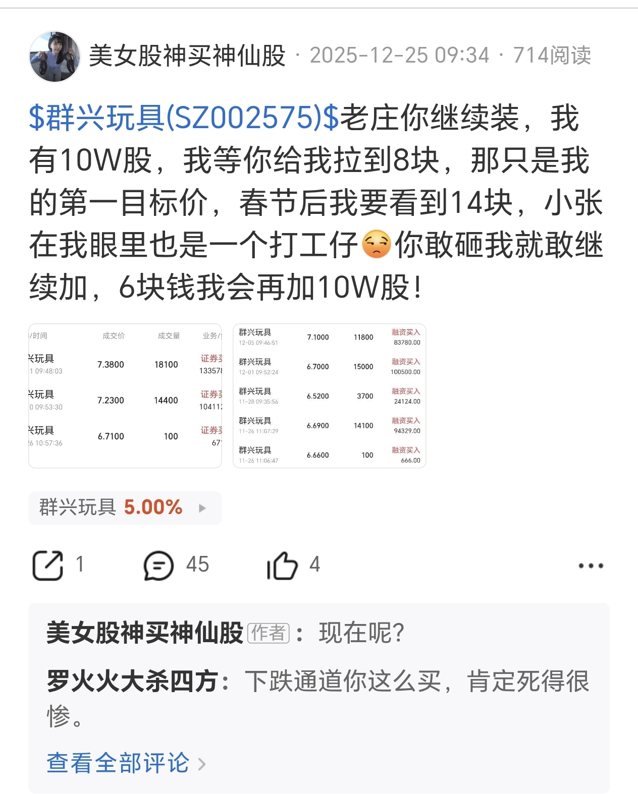 $群兴玩具(SZ002575)$ 刚才发帖提示大家该减仓减仓了,风险机会都存在,应该保持轻仓位,等趋势确定了再大头往里冲。现在容易挨闷棍。宁愿吃不上这口肉,也不能挨狠揍。下午能拉起来最好。