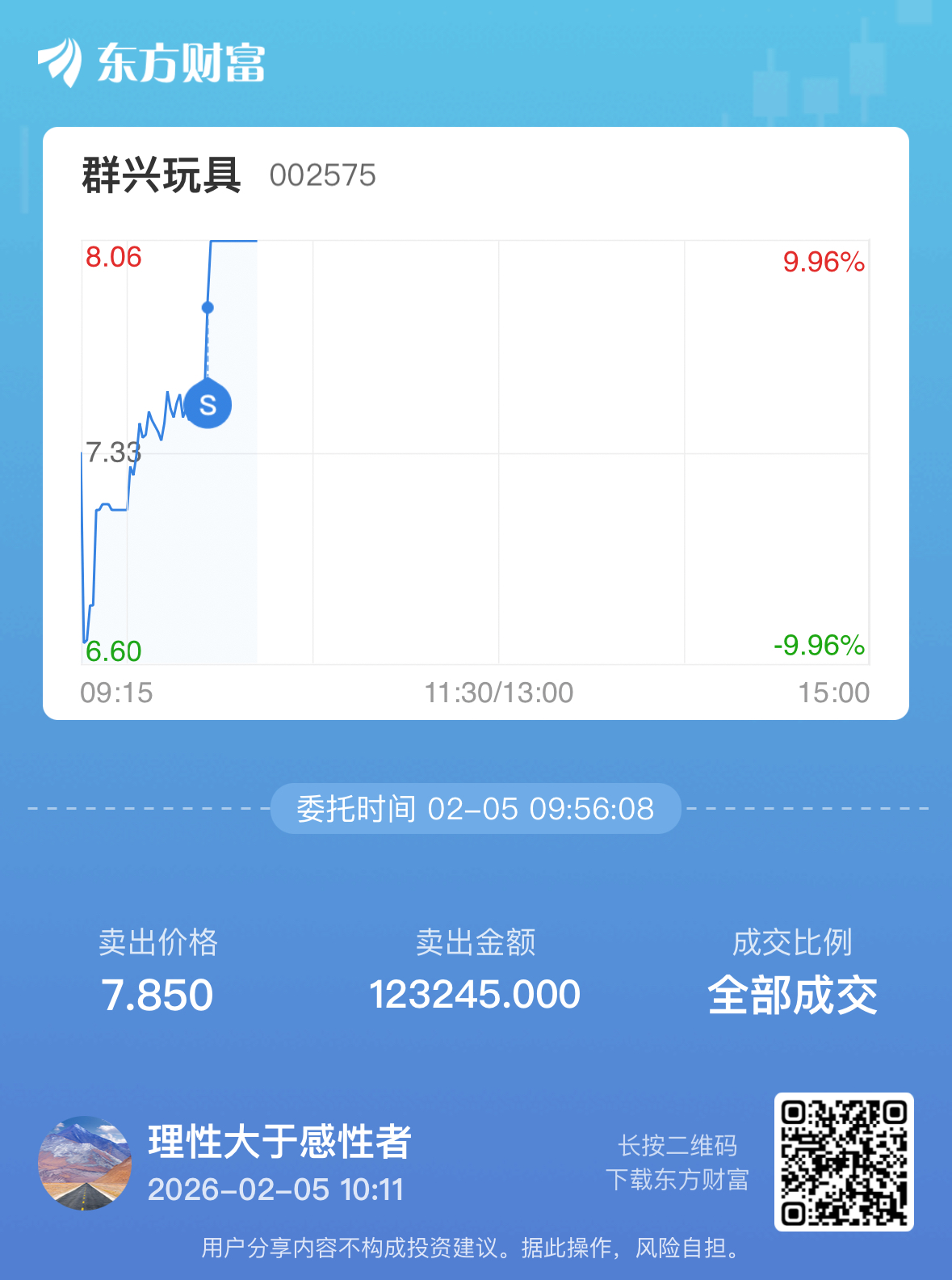 $群兴玩具(SZ002575)$ 玩了个寂寞。平仓出的 没挣。哎