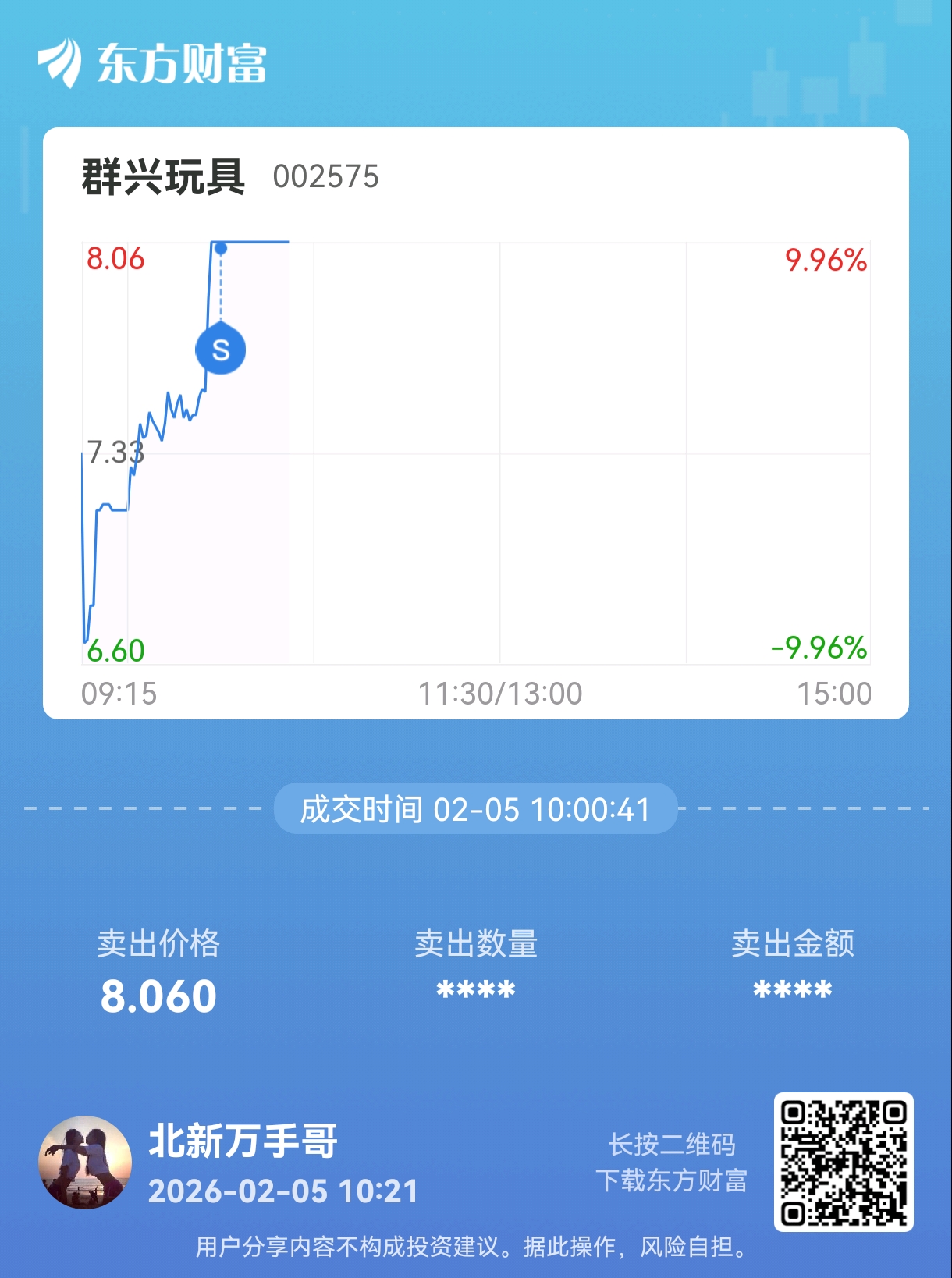 太会玩了,我已经吓破胆了,不玩了,我卖出的股基本都成妖股,群兴也成妖吧,去年11