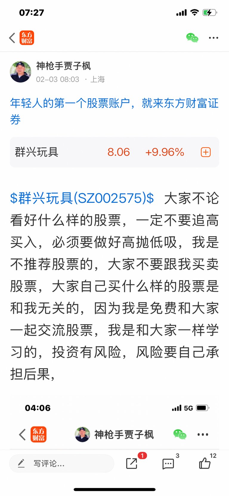 $群兴玩具(SZ002575)$ 这个是我二月三号看涨的股票,大家不要追高买入,必须要做好高抛低吸,我是不推荐股票的,大家不要跟我买卖股票,大家自己买什么样的股票是和我无关的,因为我是免费和大家一起交流股票,我是和大家一起学习的,投资有风险,风险要自己承担后果,