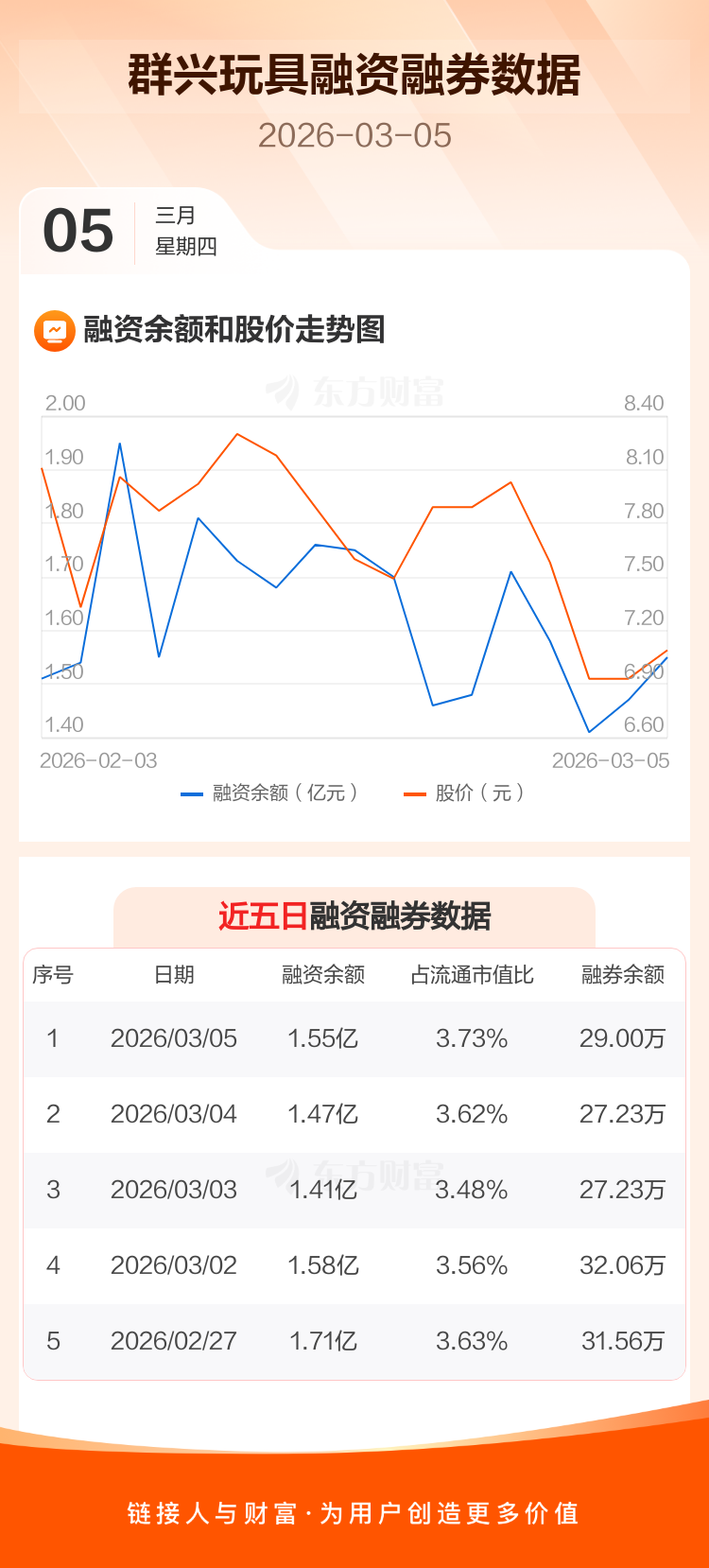 交易所最新数据显示,群兴玩具于2026年3月5日获融资买入2610.29万元,融资偿还1849.43万元,当日融资净买入760.86万元。目前,该股融资余额1.55亿,占流通市值比例为3.73%。