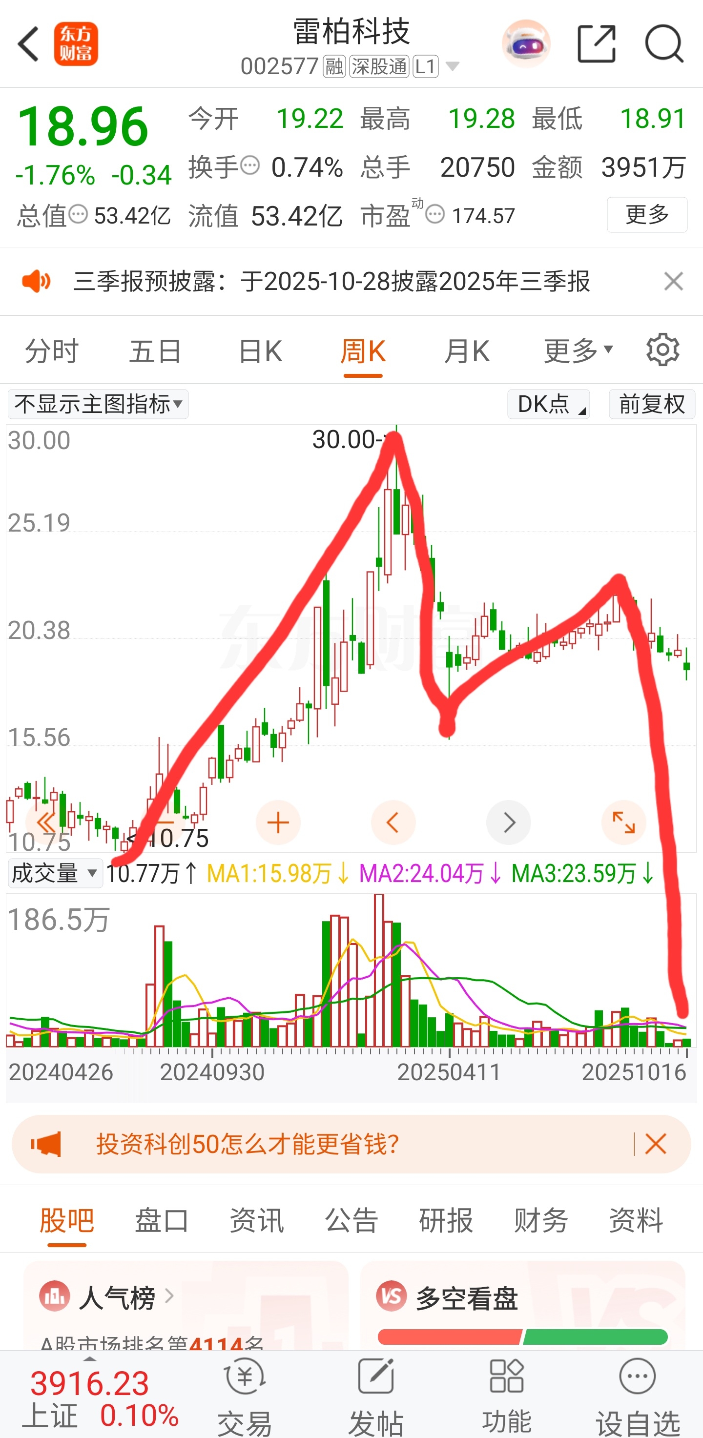 $雷柏科技(SZ002577)$ 周k右侧高点已现,怎么看都会跌破前期低点,必跌破10.75元