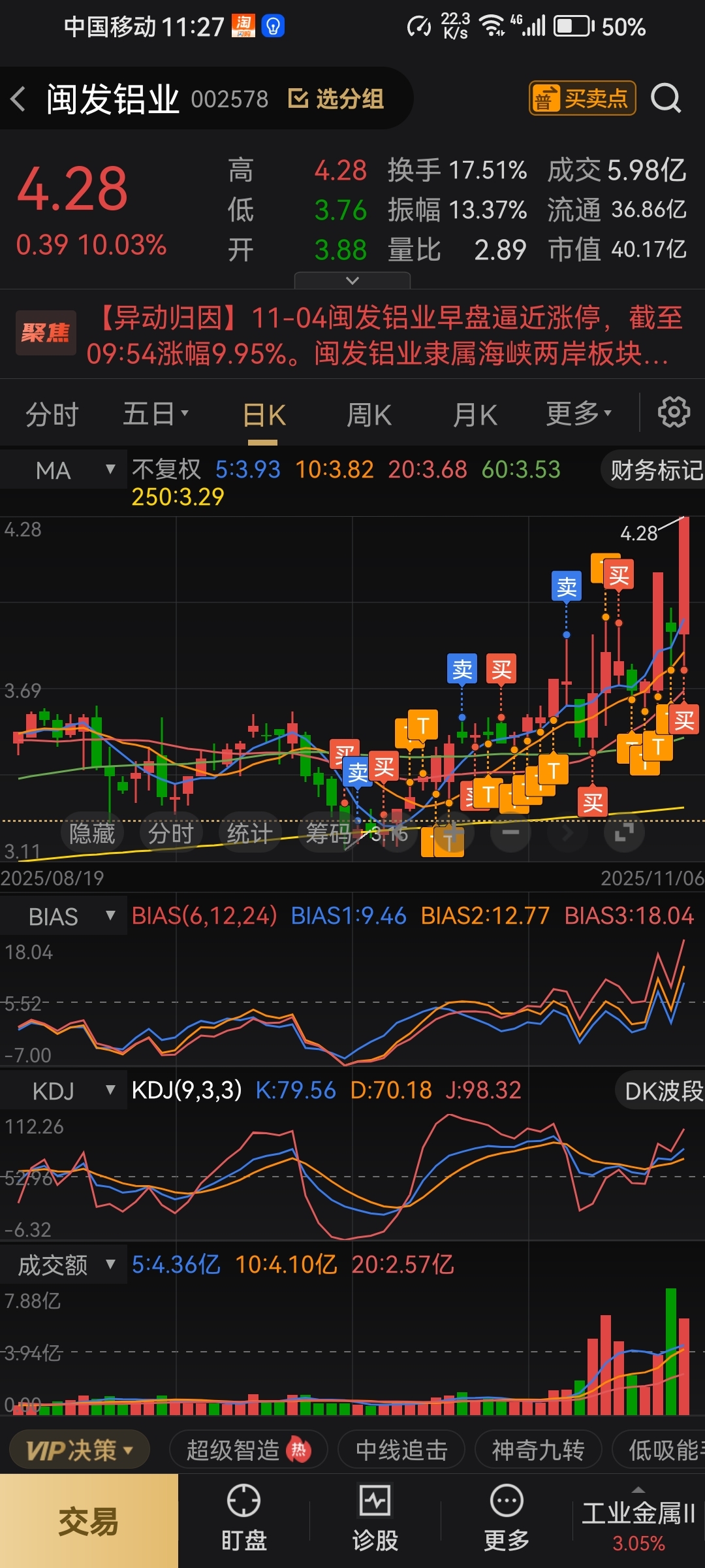 $闽发铝业(SZ002578)$ 长线投资,底仓不动,逢跌就买,并做t#炒股日记# #收盘点评# #股市怎么看# #实盘记录# #强势机会#