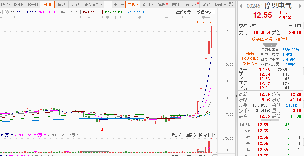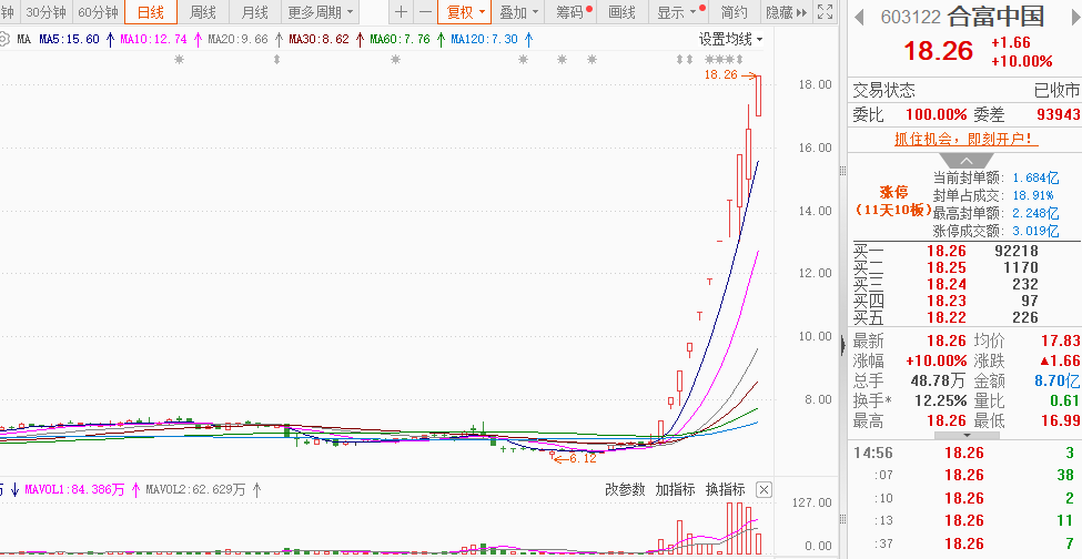 和富中国:医药+海峡。目前11天10板,连板王者霸气显露,目前的最高标,只有周一没有涨停,但也是上涨,随后周二继续连板G上,封单1.6个多亿,主力还有余力继续向上冲锋,造妖阶段,起码目前还有空间,估算13板左右。