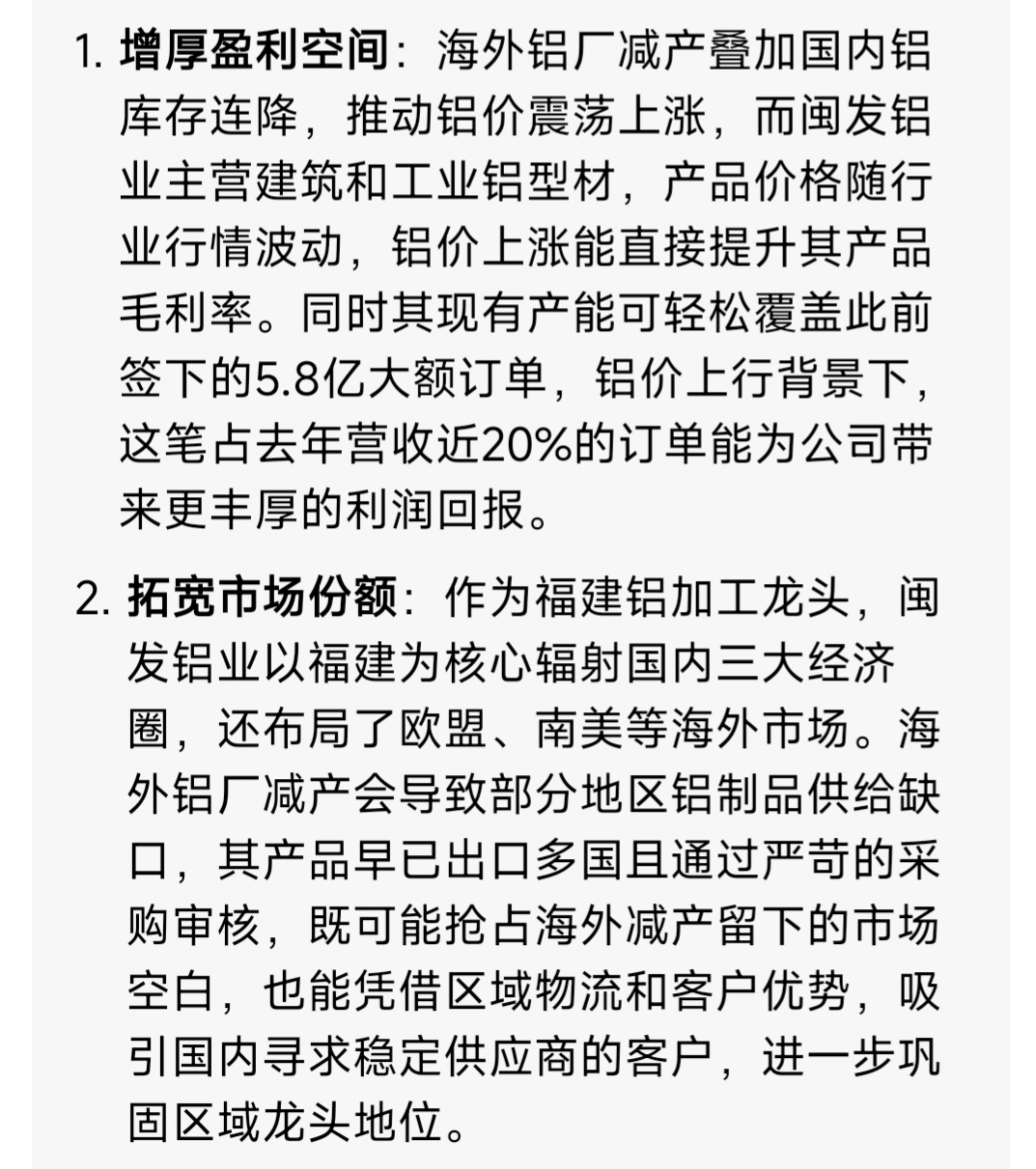 $闽发铝业(SZ002578)$ 闽发这波必破9块历史前高,区域龙头,还是行业领先企业,十五五重点规划产业,是比亚迪托盘的独家供应商,加上国际两大铝厂一个停产,一个即将停产,必将带来铝业的严重稀缺,就连用于新能源的铜业都大涨了不少,铝业更是新型产业不可缺少的一部分。再一个,就目前闽发已经轻松签了5.8亿的大型订单,国外减产后对闽发来说是一个非常重大的利好信号,铝业的稀缺肯定会导致铝业的毛利大增,铝业的稀缺也会带来国内国外更多的订单,加上福建板块最近强的可怕,加上福建的绝对铝业龙头地位,拿着必破新高,破了新高还有新高,家人们都懂!