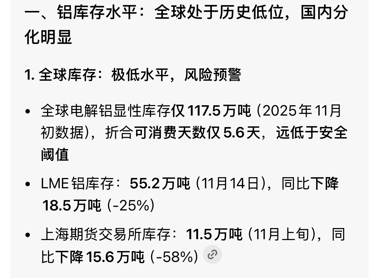 全球铝库存仅够五六天用,相当于超市里的货只够五六天卖的。而上游工厂又不能扩产,两个原因,一是供给侧和碳达峰要求不准扩产,这是硬性政策,二是生产会消耗大量电能,现在全球电力偏紧。所以板块中军$中国铝业(SH601600)$ 业绩非常好,而且股价处于历史底部,大级别趋势逆转,所以大的风险基本很小。就看主力在板块选择哪一只为情绪龙头了。可能是$常铝股份(SZ002160)$ 也可能是闽发铝业,当前看这两只有点像情绪龙头,如果长线还是中国铝业合适。爆发力强的短线情绪龙头大概率是常铝或是闽发。#周末杂谈# #炒股日记# #复盘记录#