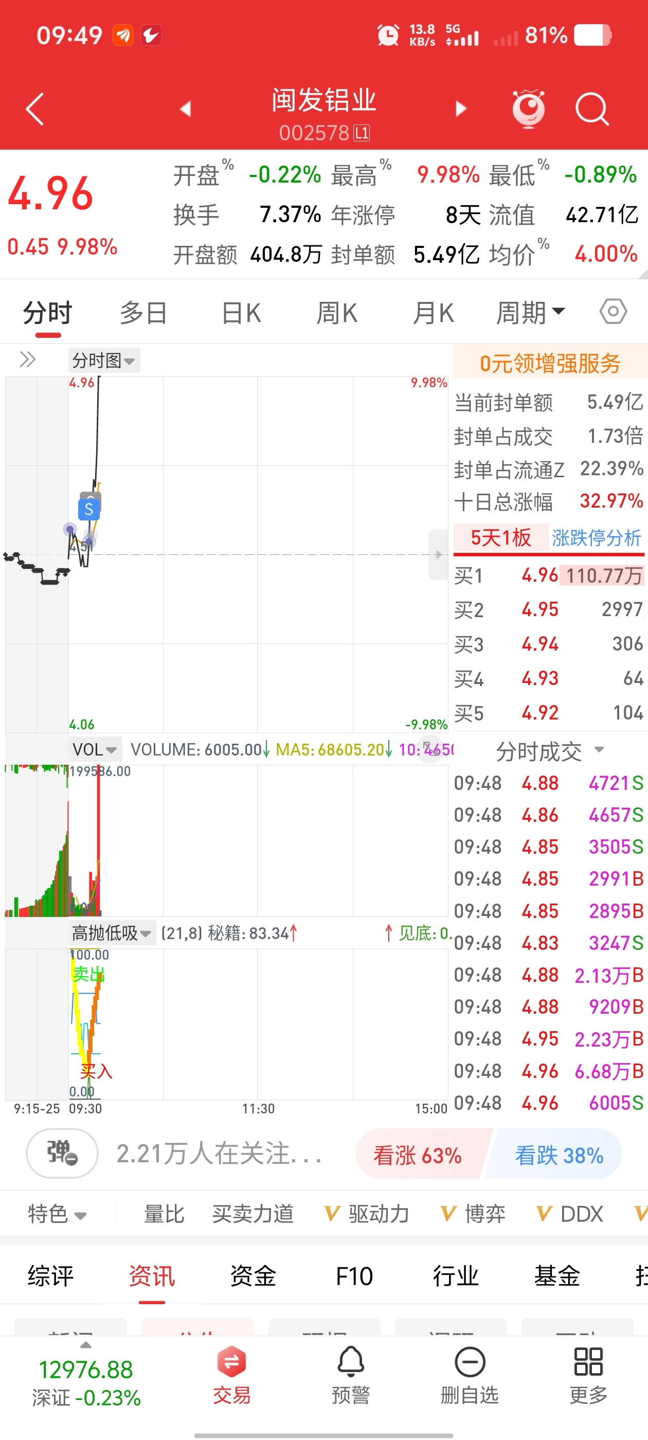 $闽发铝业(SZ002578)$ 卖飞的到这里一起哭,0.66%,1.0%就卖完了