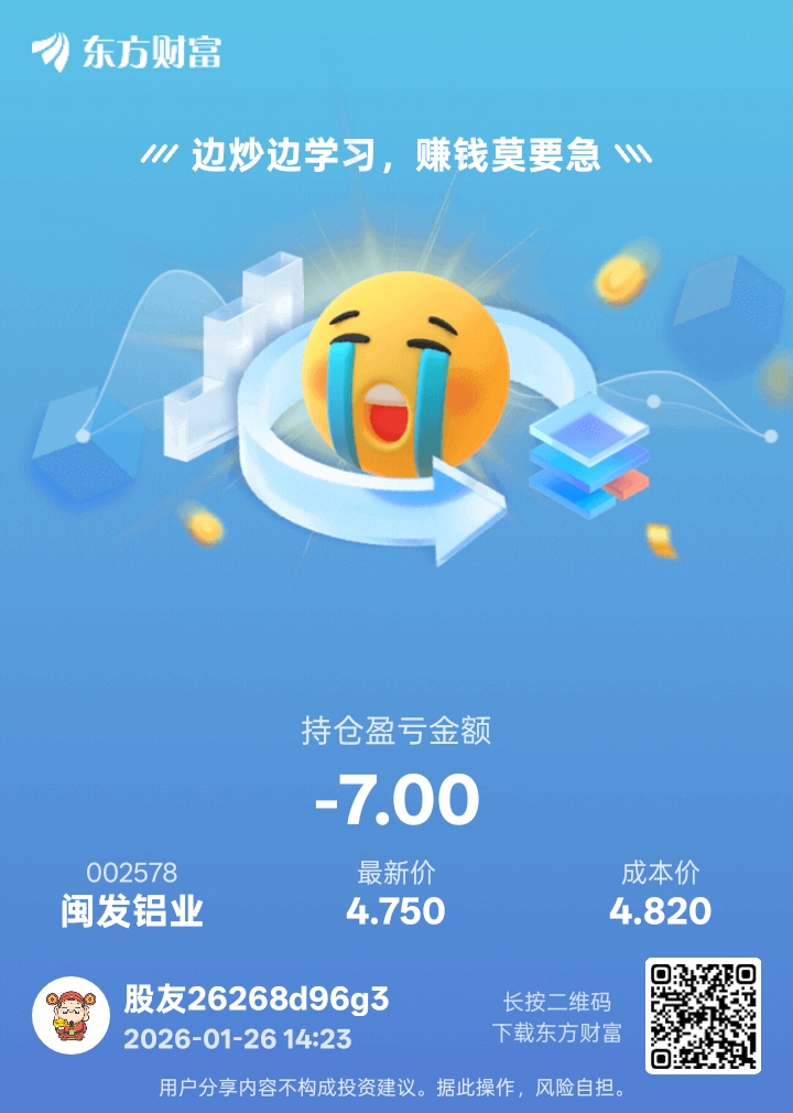 温馨提示: 1.根据《证券法》规定,禁止编造、传播虚假信息或者误导性信息,扰乱证券市场;2.用户在本社区发表的所有资料、言论等仅代表个人观点,与本网站立场无关,不对您构成任何投资建议。用户应基于自己的独立判断,自行决定证券投资并承担相应风险。《东方财富社区管理规定》