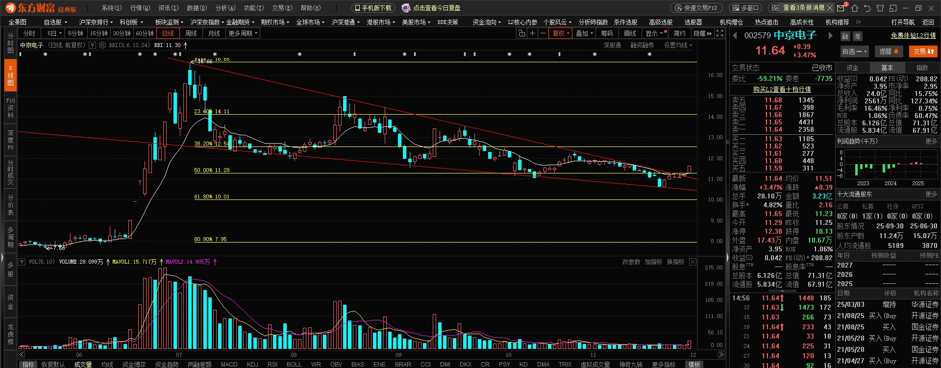 中京电子今天高开高走,放量突破收敛三角和黄金分割位共振点11.28。可以继续看下