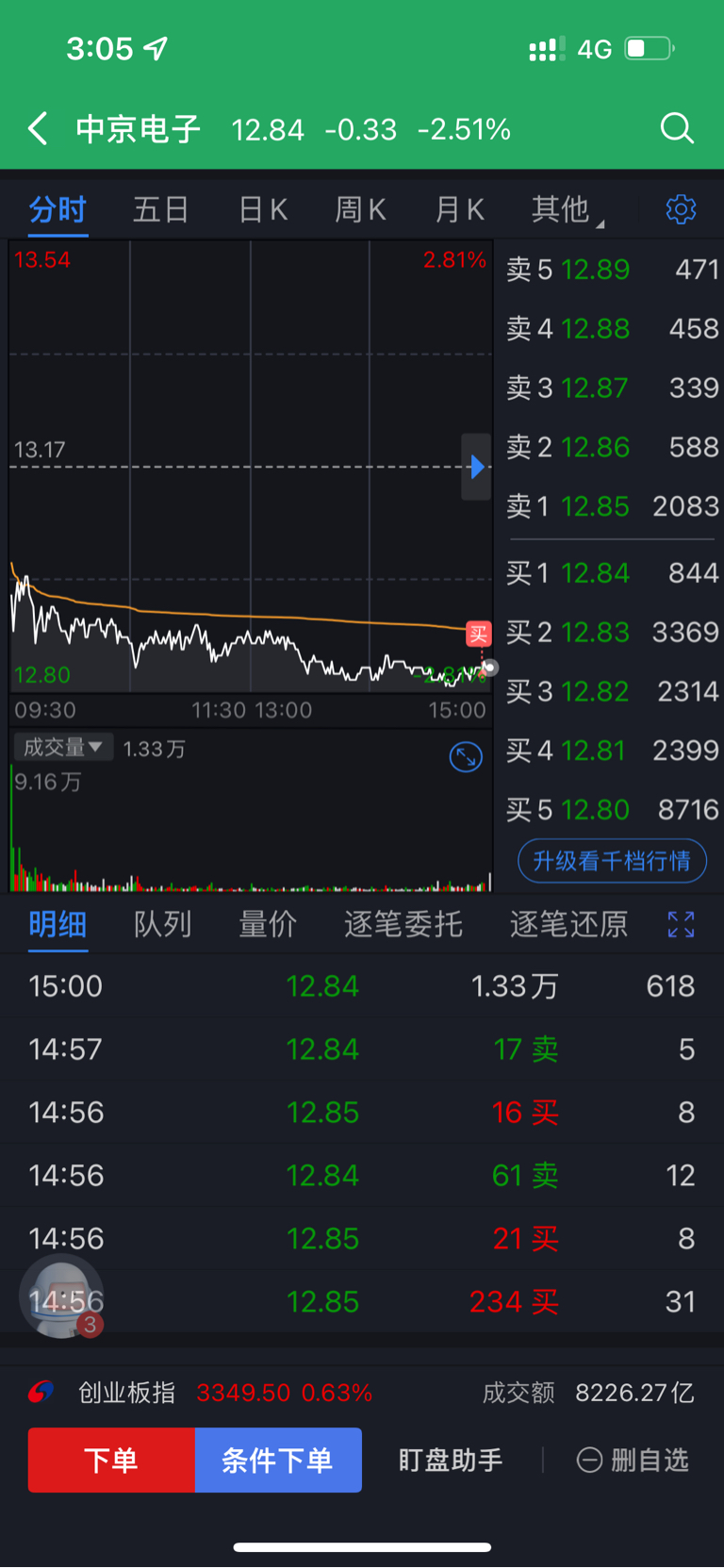 $中京电子(SZ002579)$ 昨天开门封板表态,然后撤单开门不独吃(才能走远)整天高位洗筹,本来想等12.75才进的,还是竟价冲进去了(博个周未)