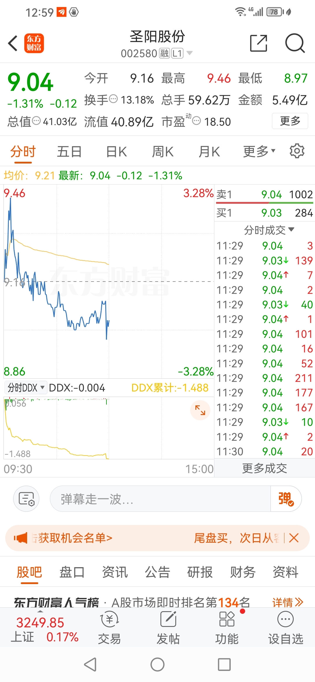 $圣阳股份(SZ002580)$ 分时针DDX下落,东方财富,大单困局