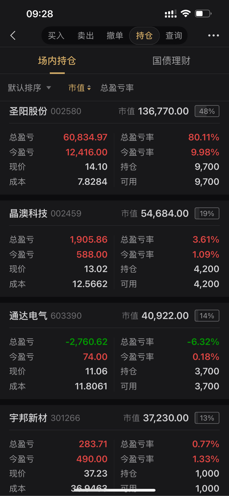 $圣阳股份(SZ002580)$ 早盘竞价结束,圣阳继续格局,其他持股不动,圣阳之前临起飞之前减了半仓,太难受了,赚钱也难受!目前持有$宇邦新材(SZ301266)$ $晶澳科技(SZ002459)$ 通达电气,暂时持股不动,点赞来财来财!