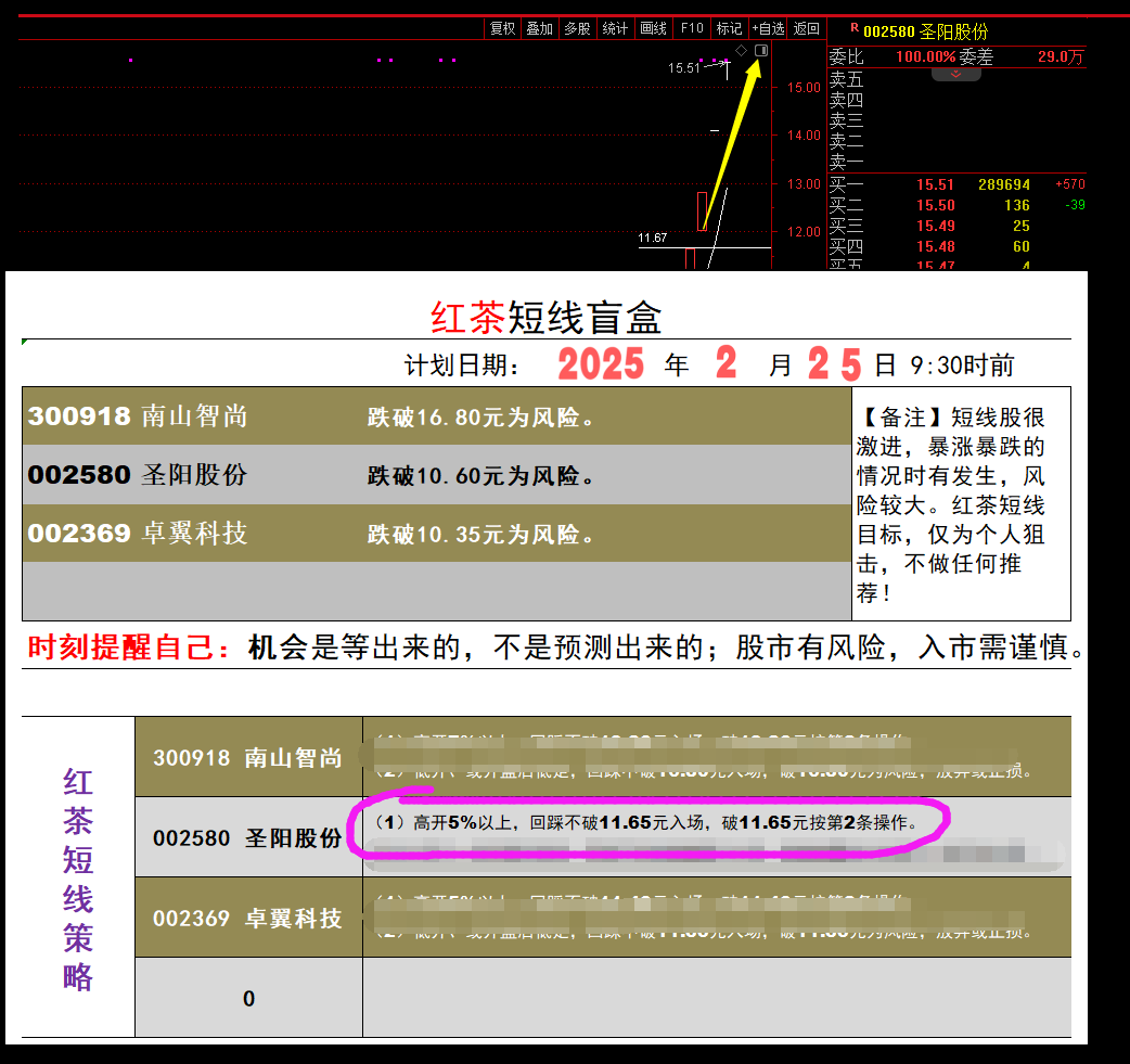 2月24日收盘后,红茶点名了三只股票,其中圣阳股份2月25日当天大阳线涨停,26