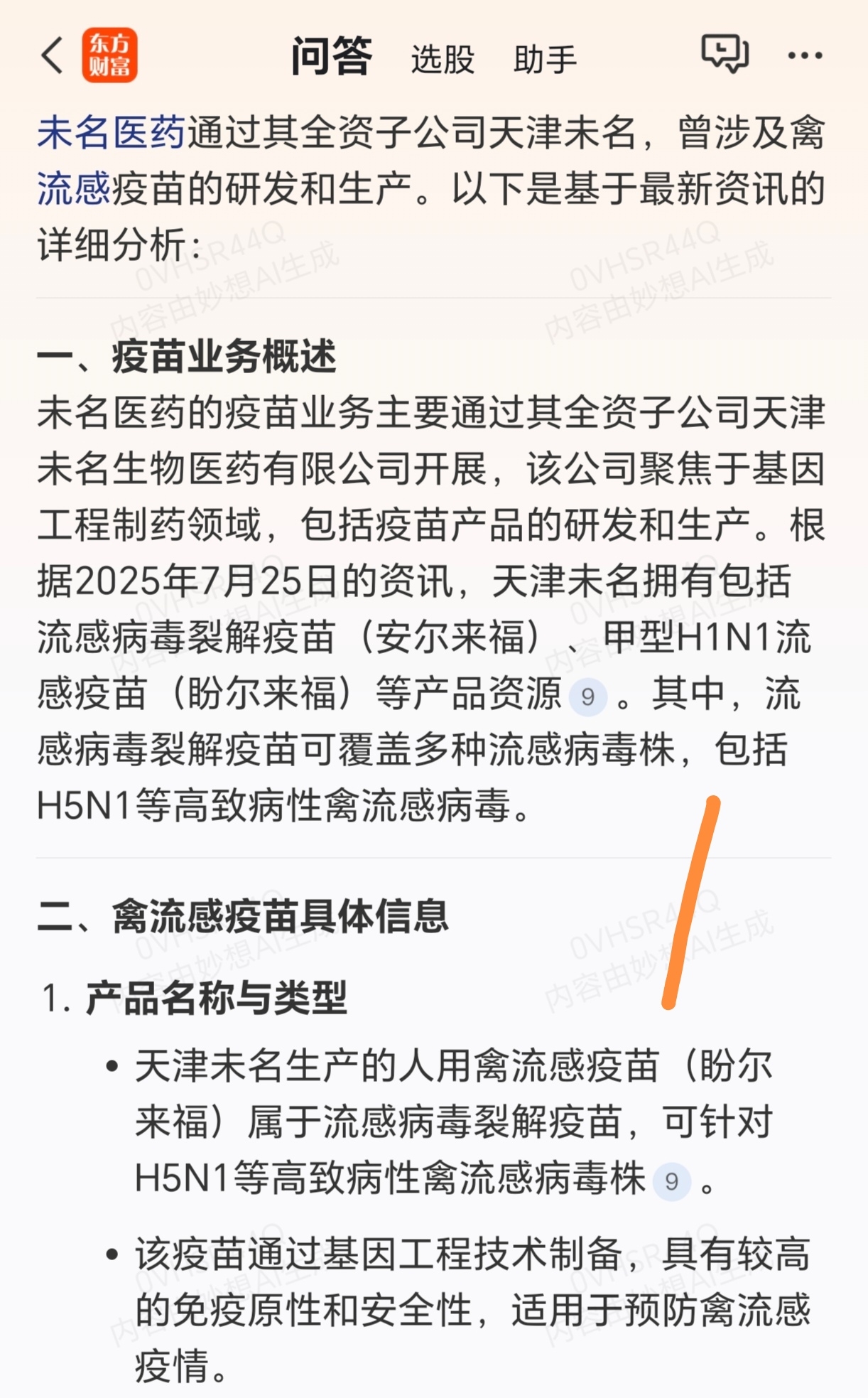 老三持有未名医药股票,也希望它有HPV疫苗,可惜未名没有,但有研发发禽流感疫苗!