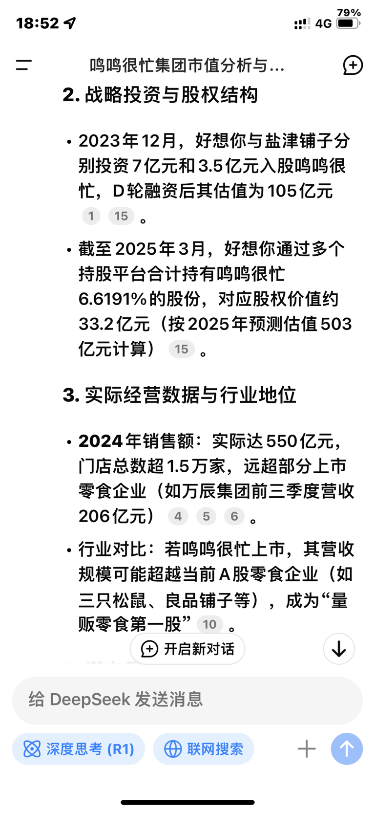$好想你(SZ002582)$ 截至2025年3月,好想你通过多个持股平台合计持有鸣鸣很忙6.6191%的股份,对应股权价值约33.2亿元(按2025年预测估值503亿元计算)。