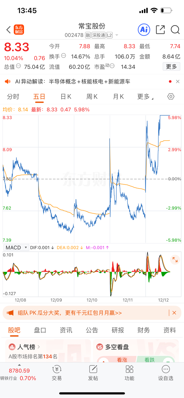 周一涨停了,常宝股份周四也是这样,今天涨停了