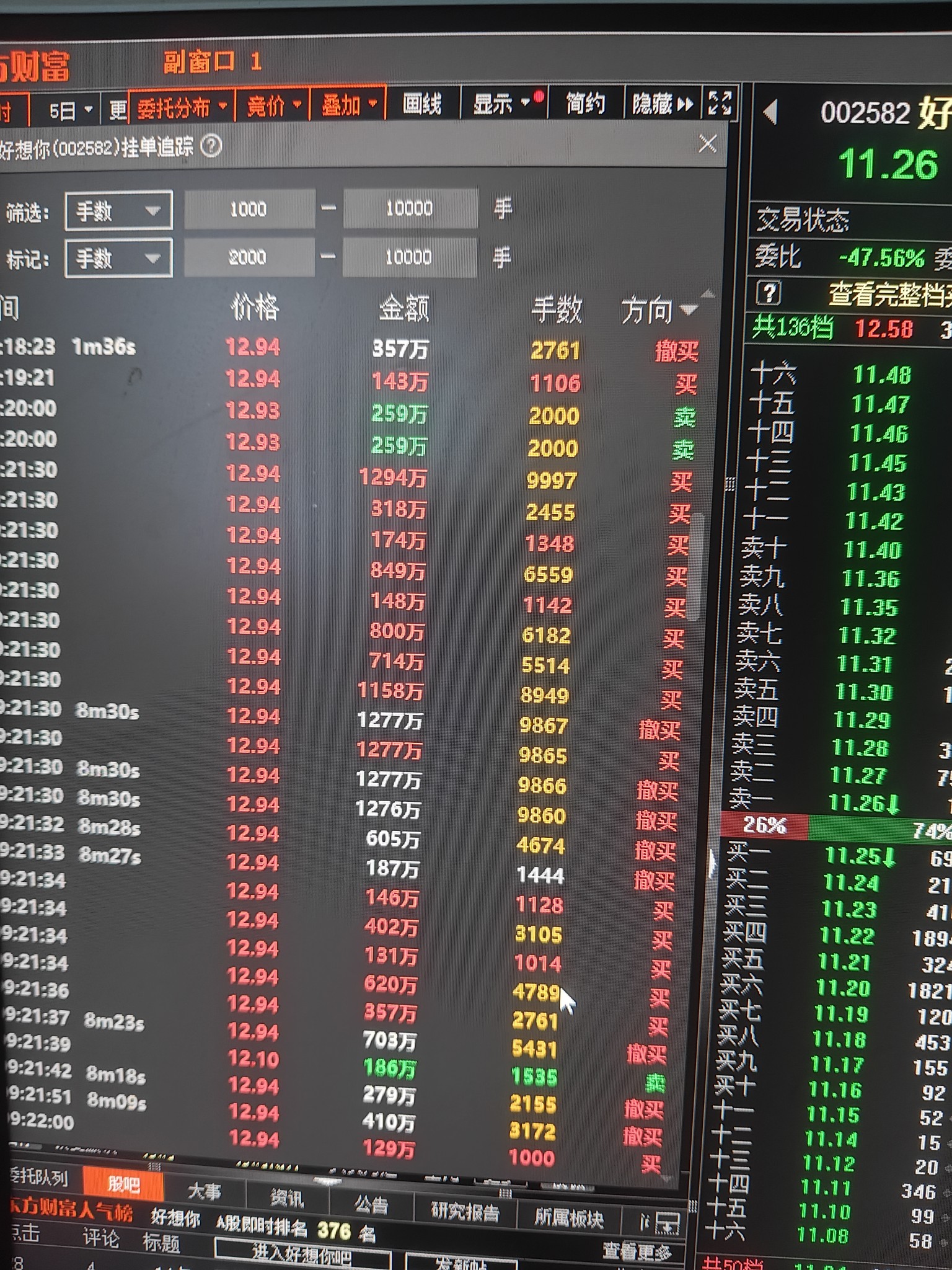 $好想你(SZ002582)$ 为什么这几个9867,9866,9860,4674他们怎么会来的急撤呢?9点25到9点29分59秒都是撤不掉,但9点25到9点29挂卖不是应该能卖了出去但一到9点30就12.9的价格,他们撤火箭速度,牛逼。。。服了服了服了