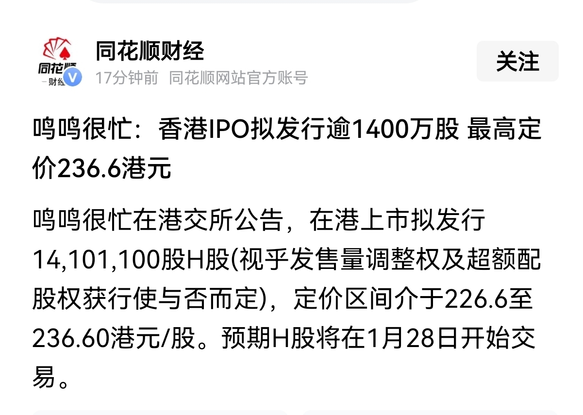 $好想你(SZ002582)$ 好想你: 鸣鸣很忙的发行价格严重超预期,是原国际投行预期的5.5倍。国际投行原打算发行7666万股,募集资金4-5亿美元,实际仅发行1400万股,就募集资金5亿美元。并且腾讯作为基石投资者参与认购!