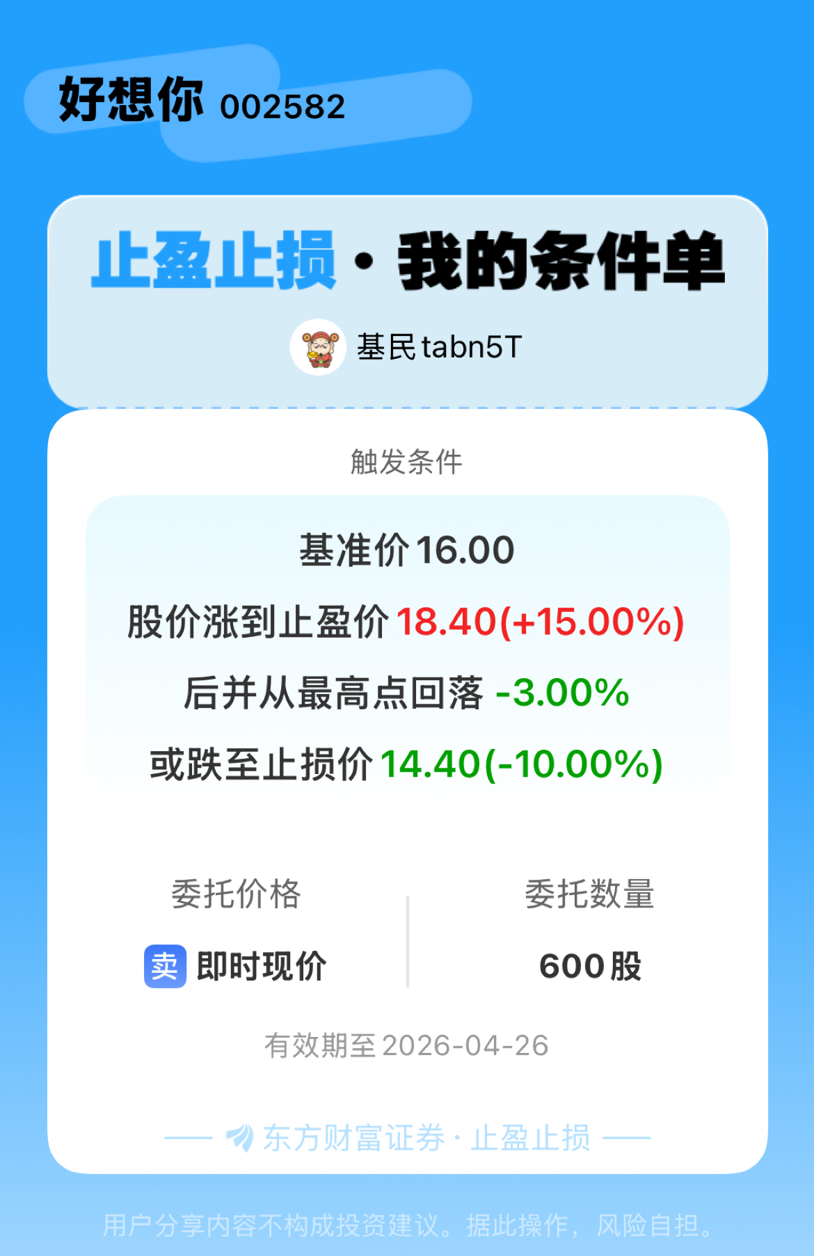 #条件单交流# #止盈止损晒单# 一位股神设置了一个止盈止损条件单,接下来就是见证奇迹的时刻~$好想你(SZ002582)$