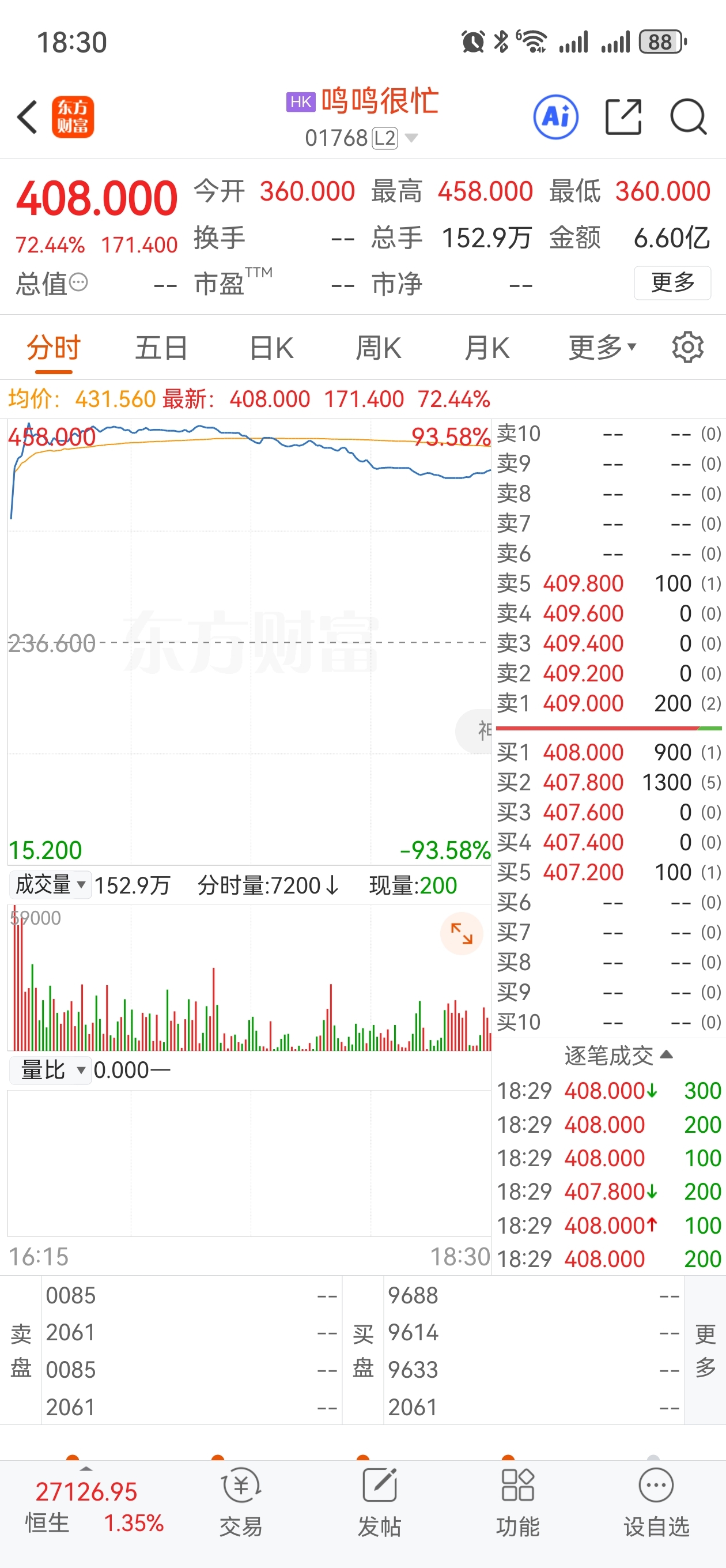 $好想你(SZ002582)$ 这个庄,这个机构连续买媒体唱空鸣鸣,顺势下杀好想你,让大家都以为鸣鸣会破发,谁知道算错一点,国际金融的大鳄,没她这么目光短浅,暗盘收408,这个好想你的投资收益46亿,减去成本7亿,算入利润39亿,预期20亿!几乎翻了一番,昨天和今天,这个机构丢了不少筹码!明天涨停继续砸完吧!安心出局!