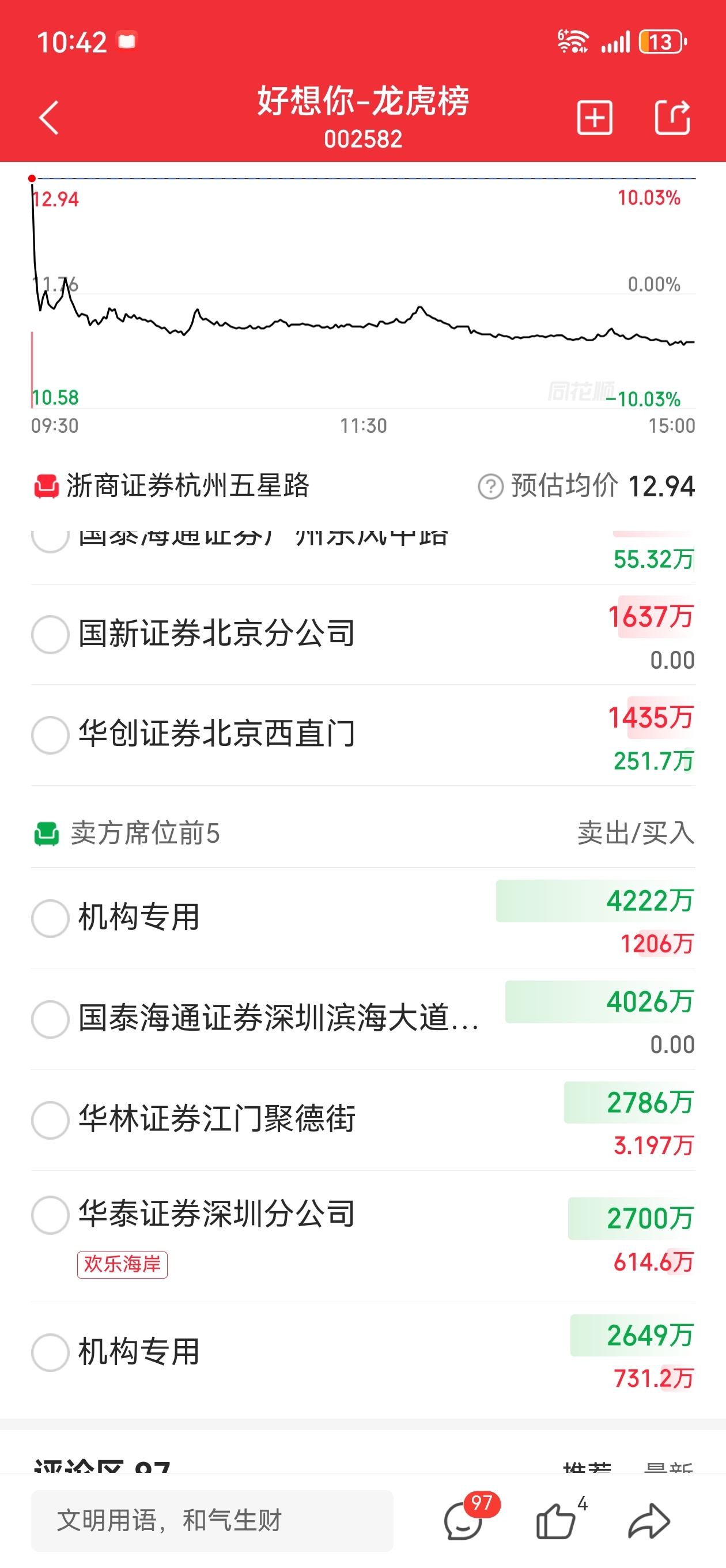 $好想你(SZ002582)$ 上次砸盘有个欢乐海岸,大家记住它,下次它买的票都使劲砸