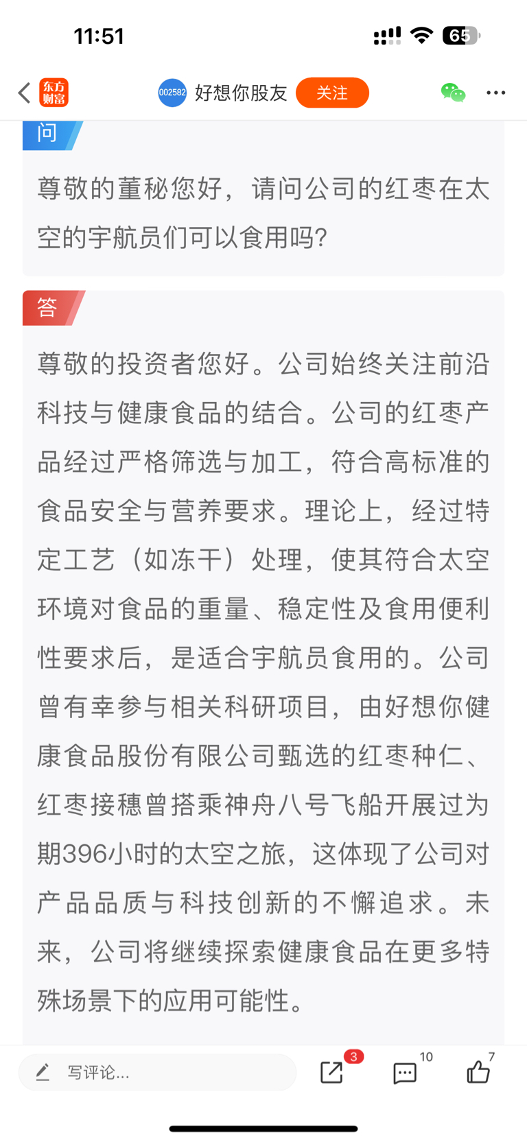 $好想你(SZ002582)$ 商业航天概念,牛逼,红枣可以上太空,给太空宇航员吃,有参与过此类项目