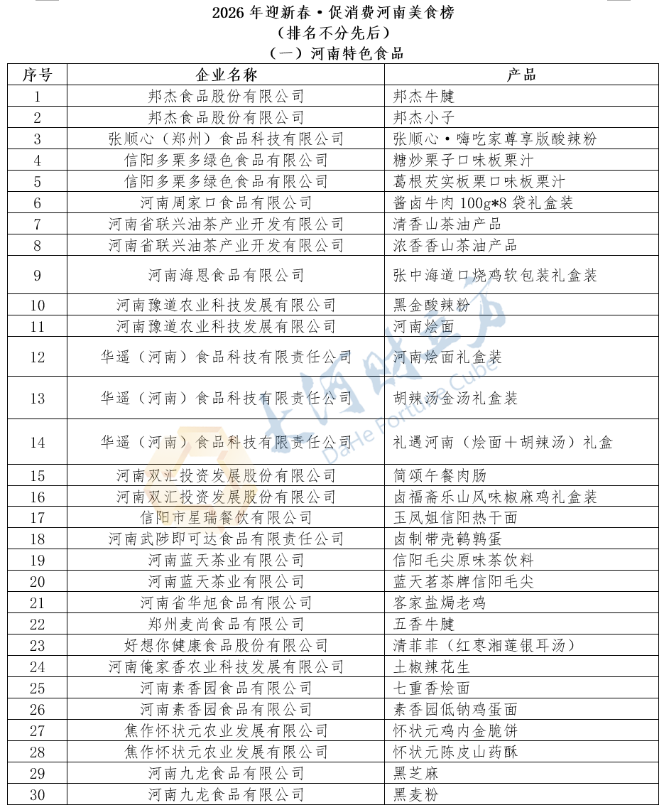 河南省食品工业协会秘书长牛景红在会上表示,按照《关于举办2026年“吃货季”迎新春促消费好酒好菜迎新年活动暨河南美食榜和河南好酒发布推介活动的通知》(豫食联〔2026〕2号)文件通知安排,在企业自愿申报的基础上,经省现代食品产业联盟与省食品工业协会组织有关专家品鉴,认定河南双汇投资发展股份有限公司、河南仰韶酒业有限公司、好想你健康食品股份有限公司等45家企业99款产品入选2026年迎新春·促消费河南美食榜。