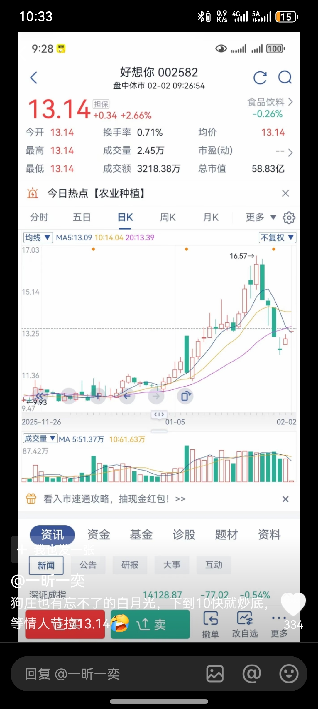 在股市上面,我相信大多数人都是很非常冷静、仔细、认真的人。包括我也不例外,我上周前发现这只股票是爱情概念股的时候,我想着如果我要买入炒作该股票的话,我会在十二号真正的确定趋势的时候然后买入。但是昨天我想我应该是遇到了我的爱情,现在我发布我的买入公告,周一开盘无论价格几何,我都会在竞价的时候买入一万元股票。
