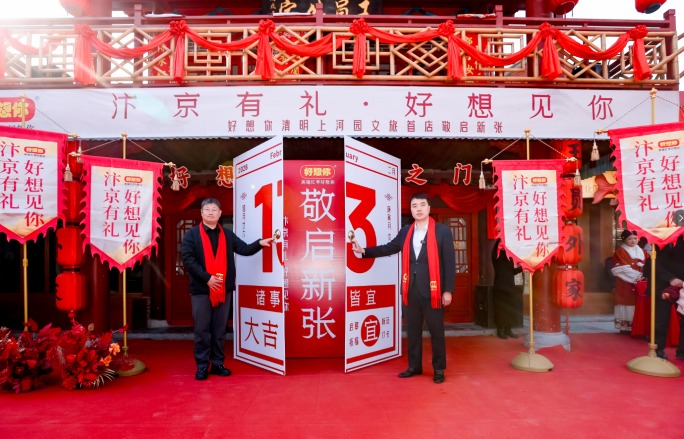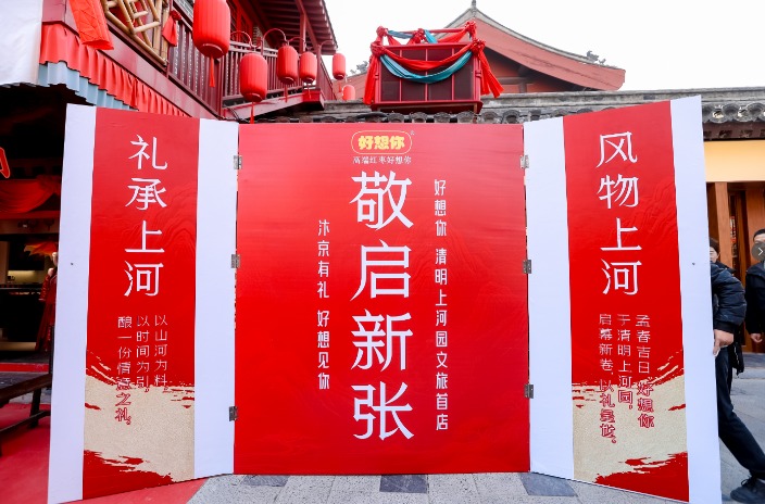 2月13日,农历腊月廿六,开封清明上河园内张灯结彩,年味浓郁。一场以“汴京有礼,好想见你”为主题的开业盛典在此举行——好想你清明上河园文旅首店正式亮相。