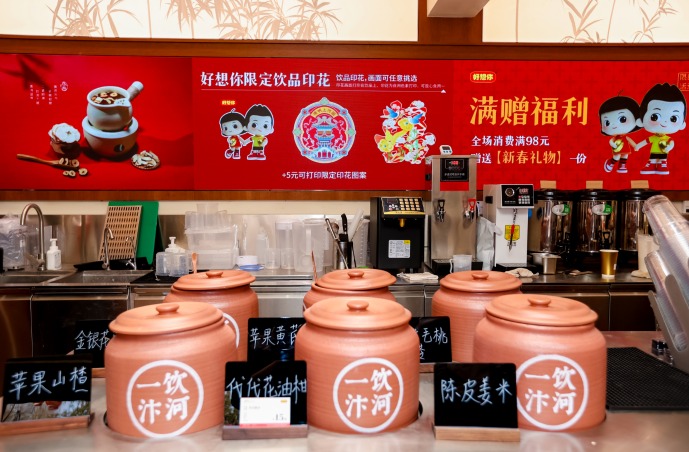 此外,店内两大体验场景,进一步将文化从“观看”升维至“感知”。在“百喜工坊”,游客可亲手盖下喜字印章,寓意“喜字留印”,将个人的欢喜瞬间永恒定格。而在“一饮汴河茶坊”,宋代盛行的“熟水”饮品被创新复刻,并搭配现代奶盖,重现了李清照笔下“豆蔻连梢煎熟水”的雅致,真正让古意与新意在一杯中温柔相遇。