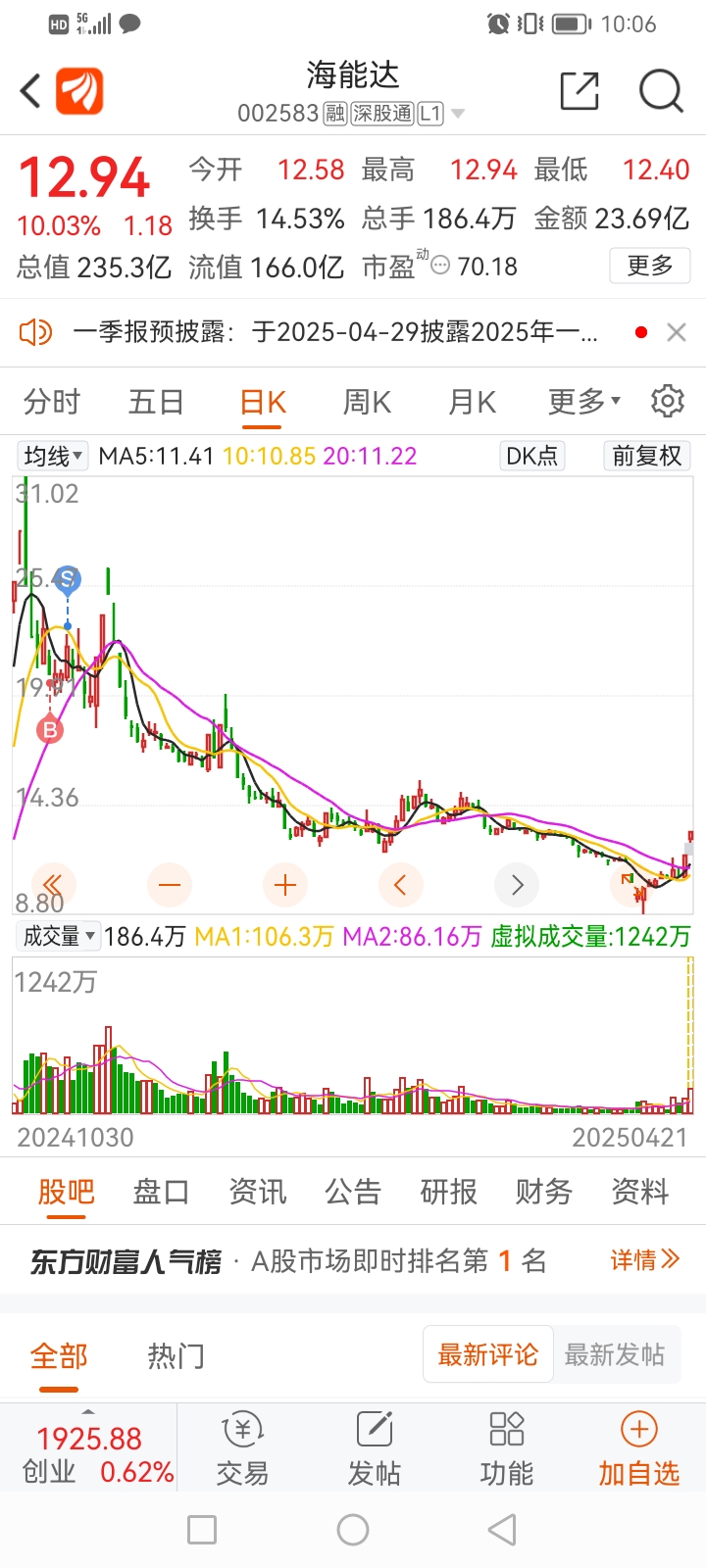 $海能达(SZ002583)$ 人气第一的还连板了,以前很少见,最近红宝丽带头,三字经的人气第一也连板,散户赚钱的机会来了,今天没追,明天再看有机会不