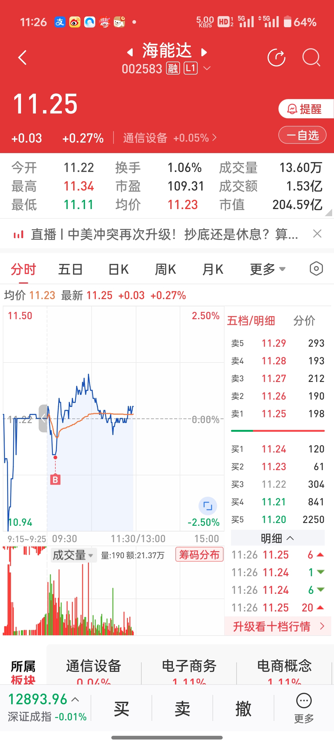 $海能达(SZ002583)$ 11.12满仓,让我吃点肉我明天就卖