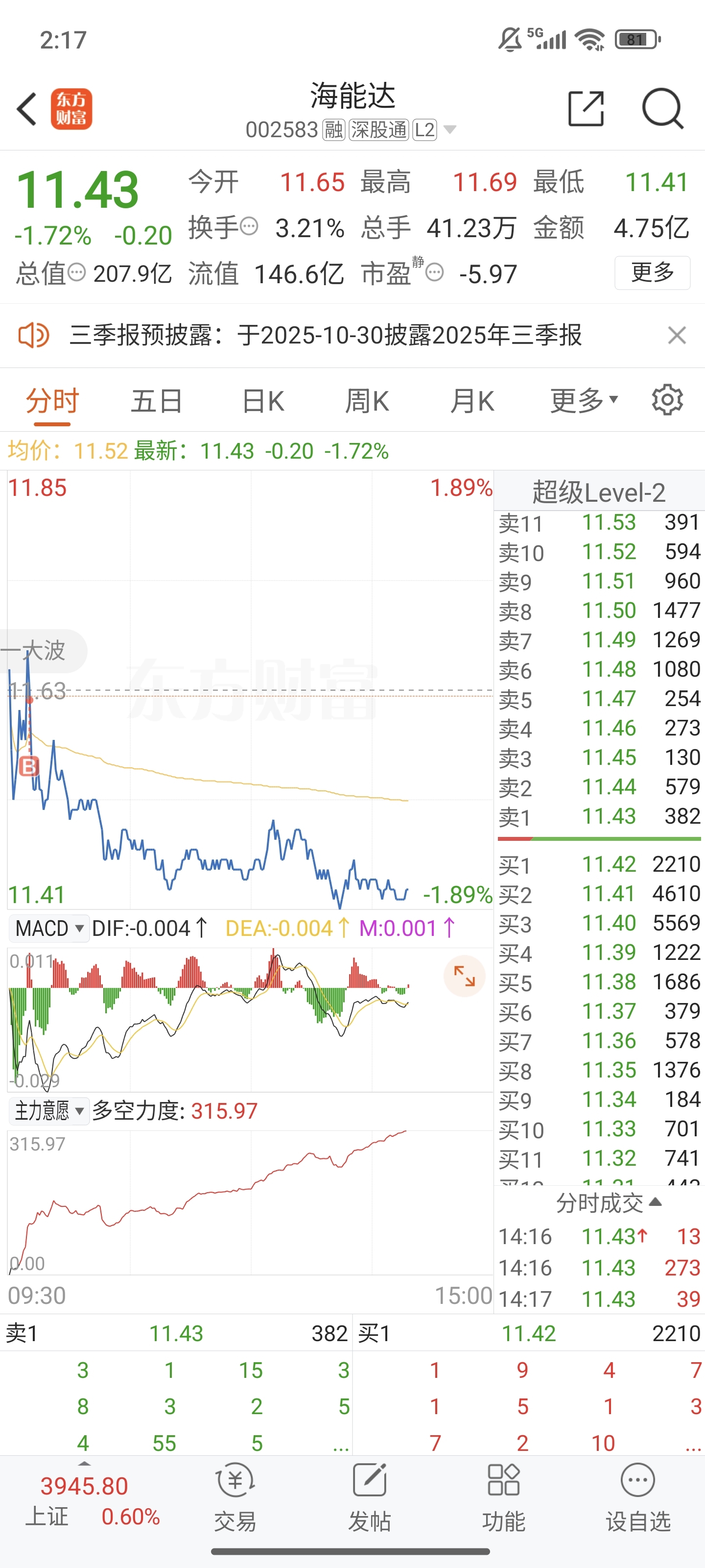 $海能达(SZ002583)$ 这多空力度是啥情况 我另外一个涨的股票 多空力度还没这个红