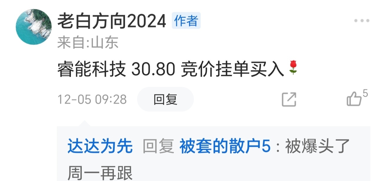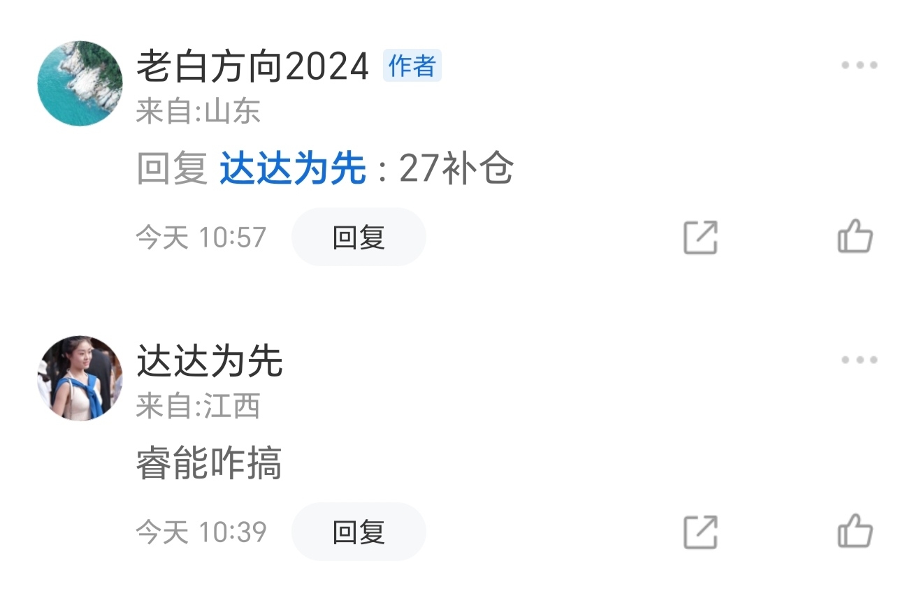 上周五竞价30.80买入的$睿能科技(SH603933)$ ,被爆头最终收盘29.61,今日竞价低开低走水下承接不错主力震荡吸筹,老白也是发文27这个位置补仓、尾盘更是冲击32.55、八个点左右减仓,目前仅剩底仓扭亏为盈