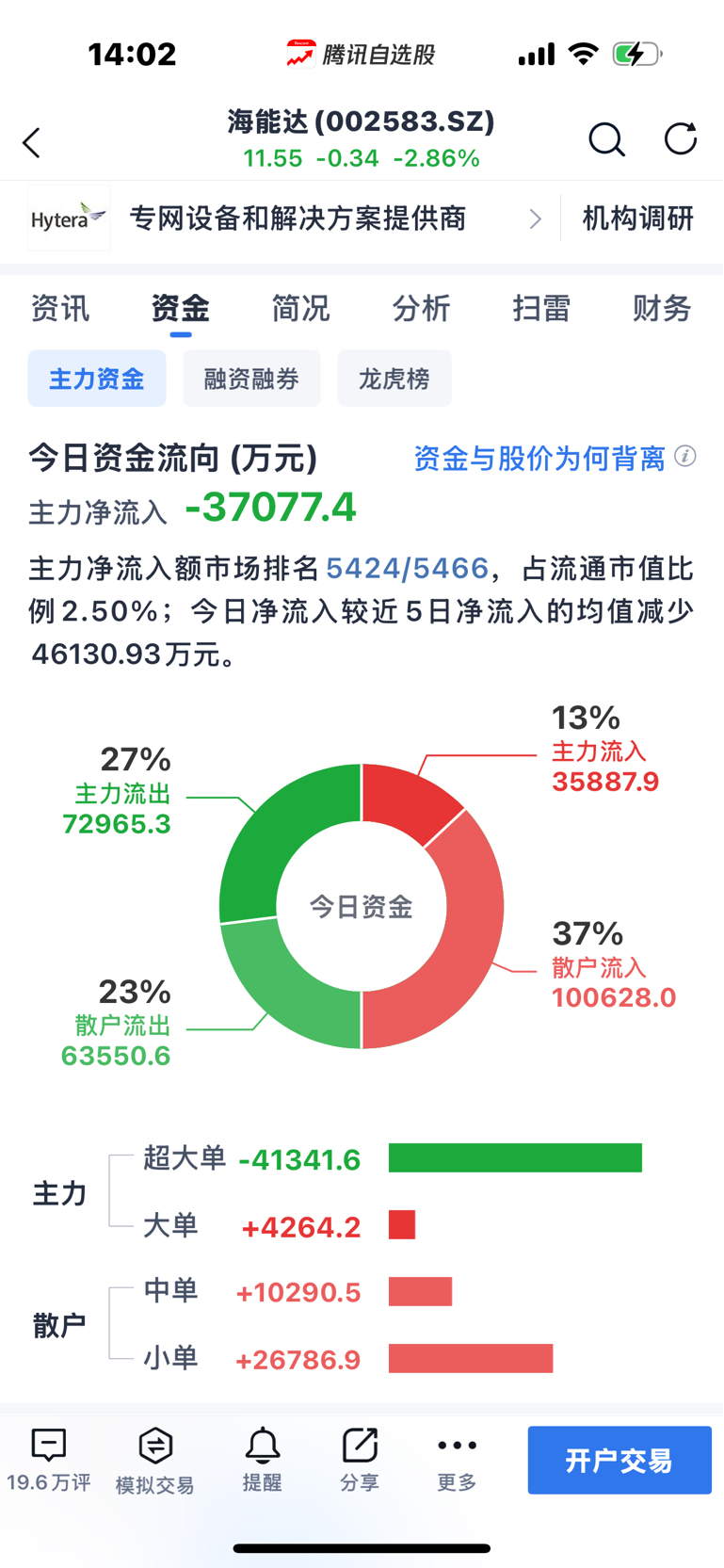 海能达上周四涨停板。周五震荡。下周一选择方向。上周四超级大买单、拆成大单,中单和