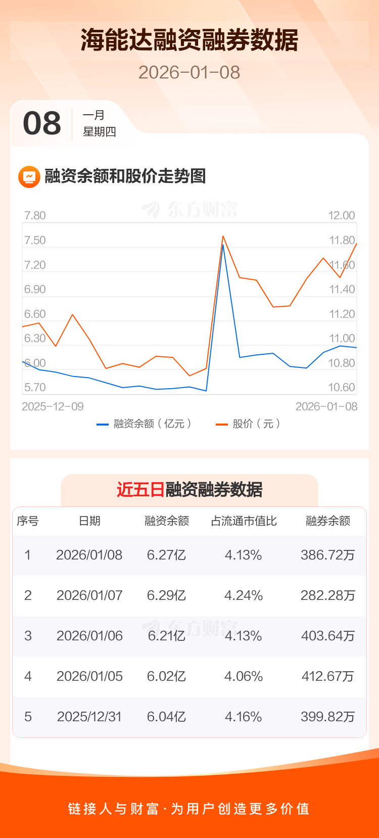 交易所最新数据显示,海能达于2026年1月8日获融资买入5891.69万元,融资偿还6028.19万元,当日融资净偿还136.49万元。目前,该股融资余额6.27亿,占流通市值比例为4.13%。