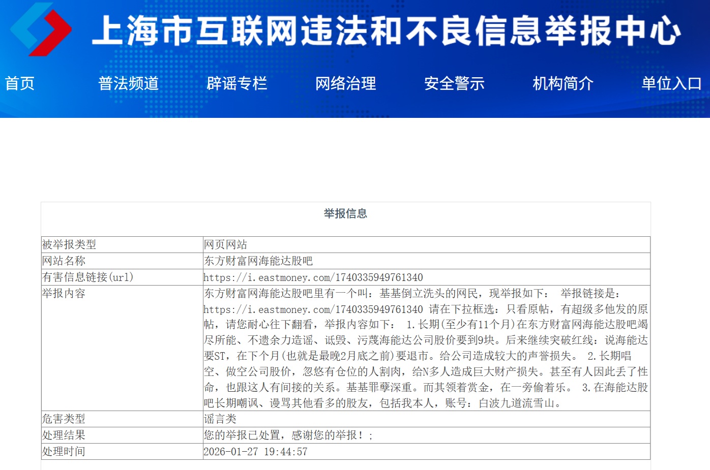 我今天上午10点多举报的,晚上19点多就已处置,感谢上海网信办的高效率!股吧终于