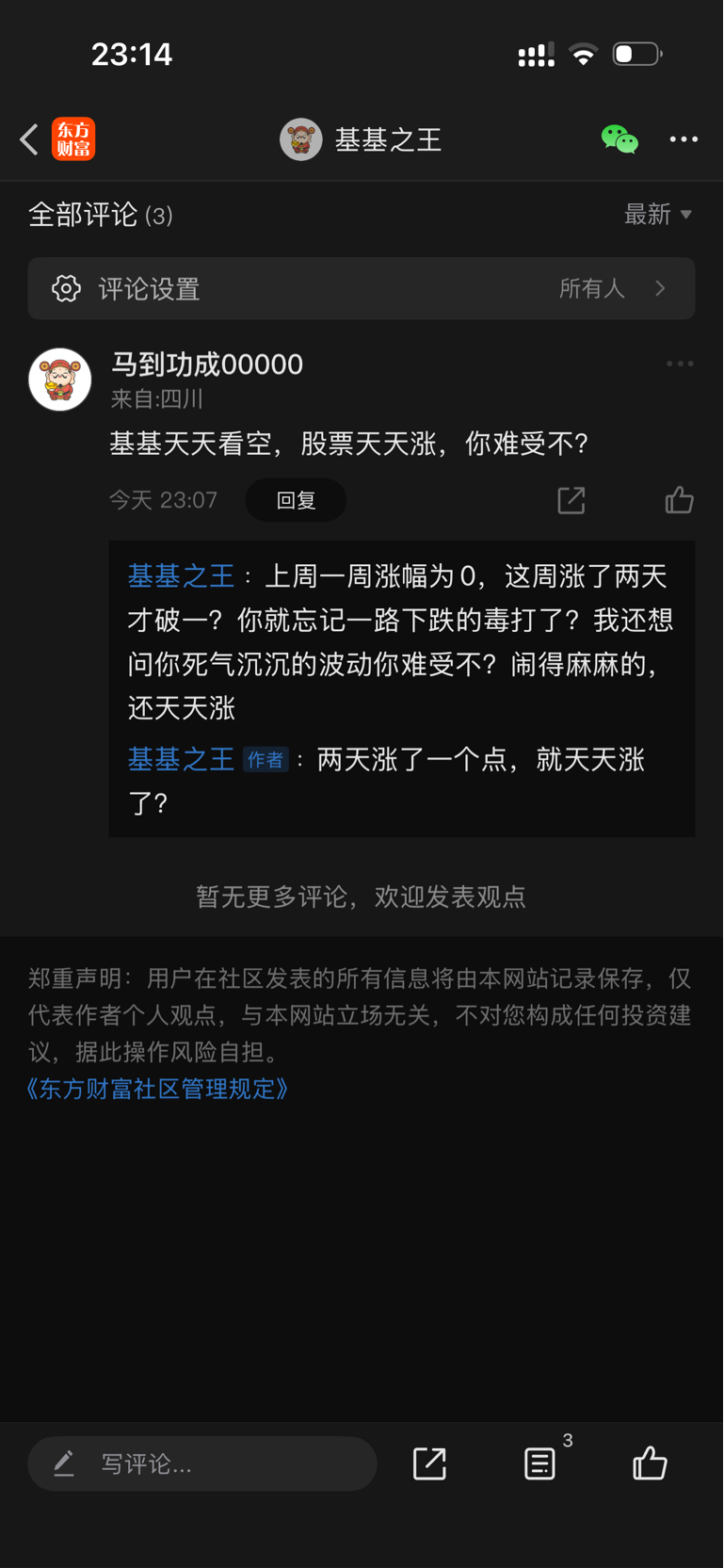 温馨提示: 1.根据《证券法》规定,禁止编造、传播虚假信息或者误导性信息,扰乱证券市场;2.用户在本社区发表的所有资料、言论等仅代表个人观点,与本网站立场无关,不对您构成任何投资建议。用户应基于自己的独立判断,自行决定证券投资并承担相应风险。《东方财富社区管理规定》